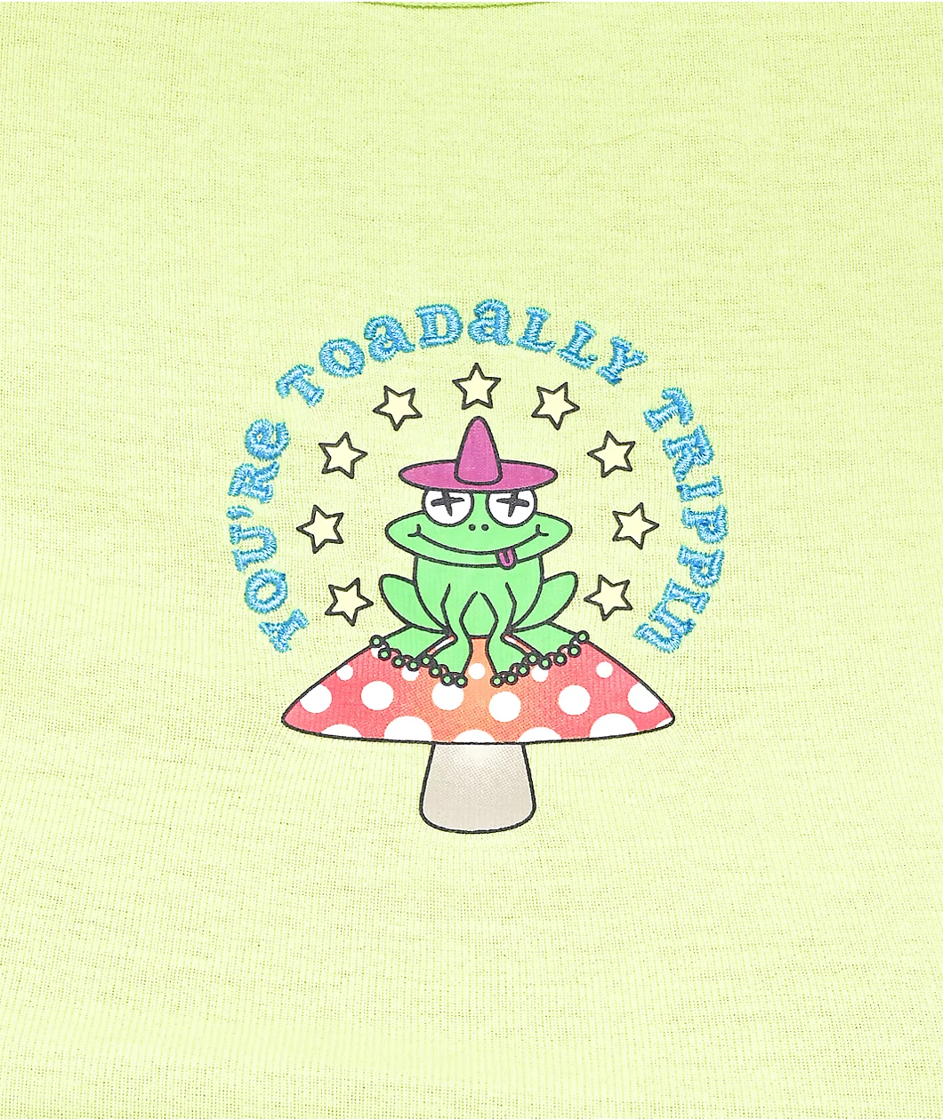 The Elish Toadally Trippin crop t-shirt from A-Lab has a soft, lightweight cotton build and bright, fluorescent green colorway. This baby tee has sleeves that are cropped just past the elbow, with a bottom hem cropped just above the belly button for a trendy look. Screen-printed on the center of the chest is a dazed toad atop a mushroom and arching text above it reading “You’re toadally trippin’.”