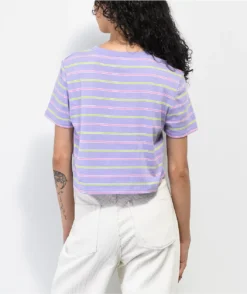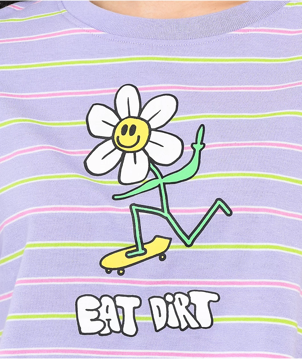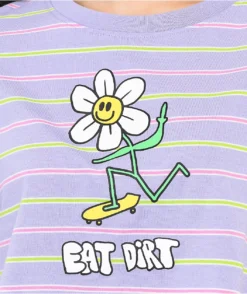 Don’t be afraid to tell people how you really feel with the Quinnie purple striped tee from A-Lab. This shirt comes in a pastel purple colorway with green and pink horizontal stripes, and features a graphic of a lil’ flower guy skating across the front, middle finger held aloft, with text reading “Eat Dirt”.