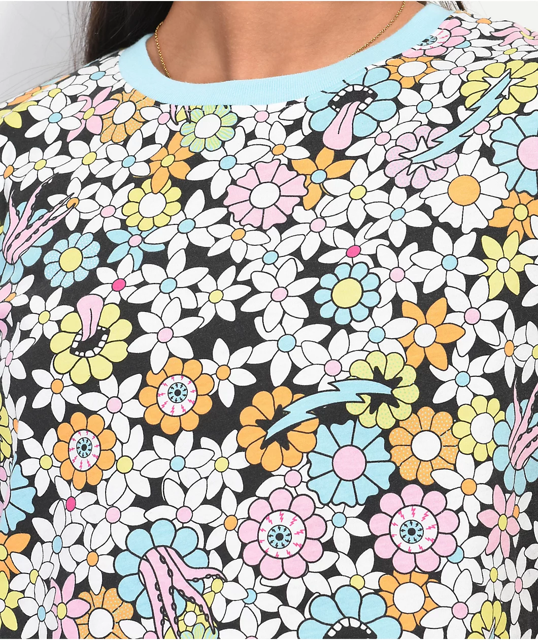 The Quinnie Trippy Floral t-shirt from A-Lab features a colorful floral print deign, with playful accents throughout. Pink, orange and yellow hues are sublimated throughout the cropped silhouette, as the tee is finished with a contrasting light blue neckline.