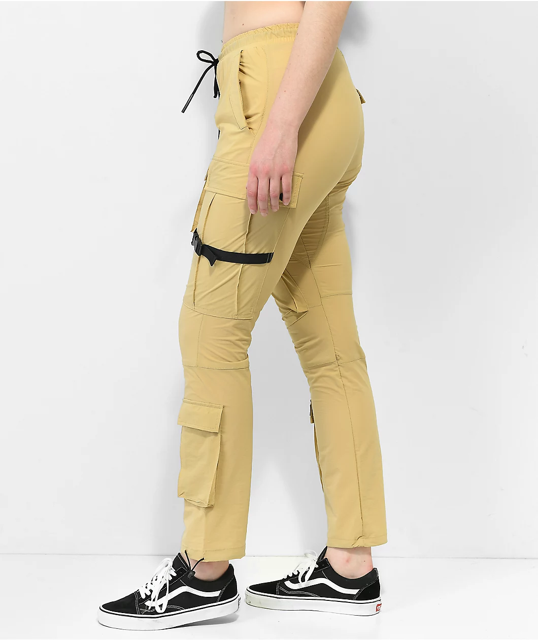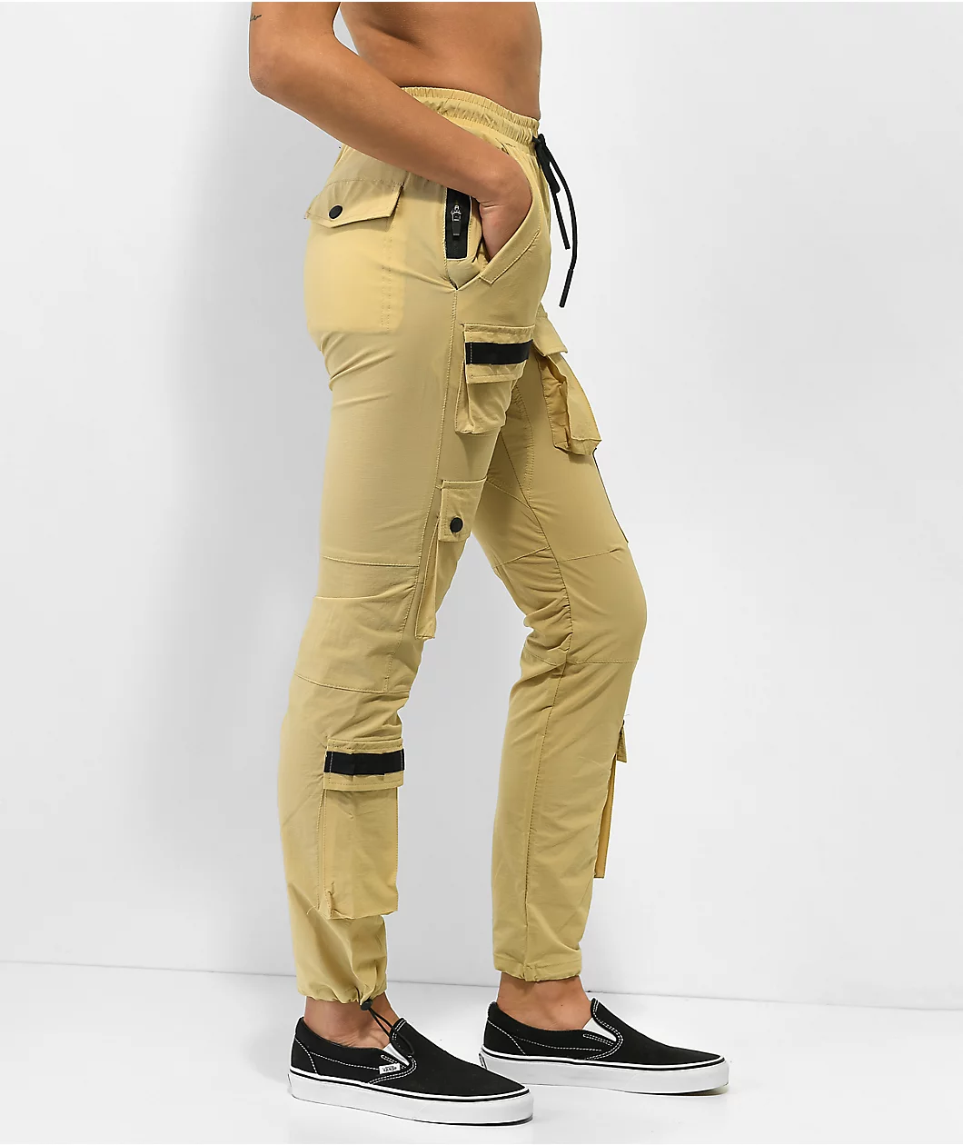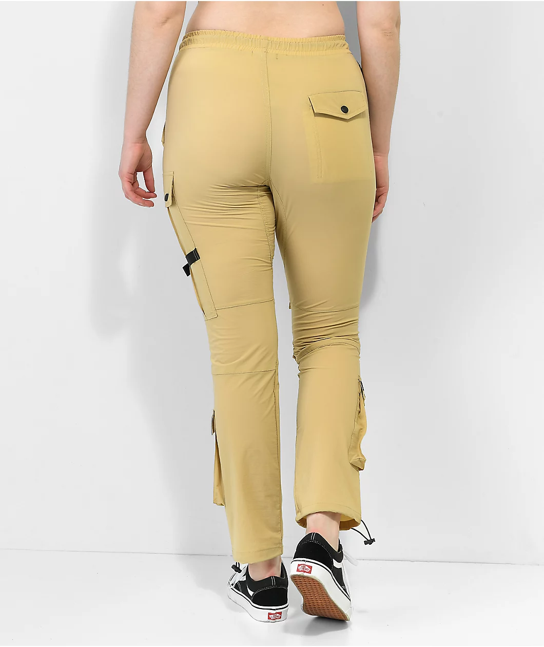 Made from lightweight, durable nylon, and added stretchy spandex, these American Stitch cargo pants are great for year-round wear. These pants have a slim fit and come in a khaki colorway. Each leg is adorned with a variety of cargo pockets, both big and small, button flap closures and standard flap closures. These streetwear pants also have drawcord-adjustable leg openings and an elastic waistband with external drawstring with custom aglets.