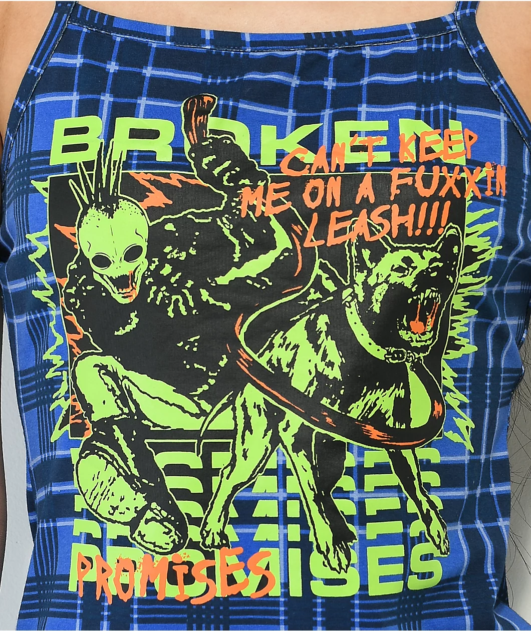 The Leash Broken Promises tank dress comes in a blue plaid pattern throughout with a screen-printed graphic on the front of a humanoid alien figure with a barking dog accompanied by script reading, “Can’t keep me on a fuxxin leash!!!” This shirt comes in a tight fit with adjustable spaghetti straps and a straight collar for a stylish look layered or worn on its own.