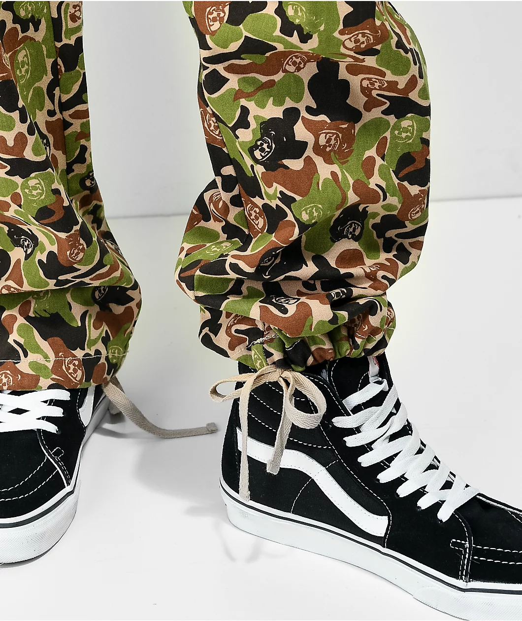 Drop some death-infused detailing into your drawers with the Reaper Camo cargo pants from Broken Promises! Slightly stretchy, these trousers come constructed from a blend of cotton and elastane, with relaxed legs ending in drawstring-adjustable cuffs, making it easy to customize their fit. These cargo pants come covered in black, green, and tan camo print, with hidden imagery of the Grim Reaper interspersed throughout it, mixing in some slick, somber style, while cargo pockets on each thigh offer up ample storage space.
