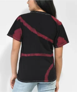Reflect your inner feelings with the Sludge t-shirt from Broken Promises, coming in a unique red and black tie-dye design. The tee features a screen-printed graphic of a skeleton gleefully sinking in green sludge, with script reading “Promises |I am a total piece of garbage” above and below. The breathable midweight cotton shirt is finished with white accent stitching along the hems, and a ribbed crew collar for additional comfort.