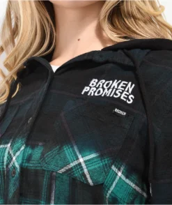 Coming in a black and green plaid construction, the Broken Promises Thomas Overdyed flannel shirt has a built-in adjustable hood for a layered look. The plaid long sleeve features a unique ombre tie-dye effect throughout, while an image of a hooded reaper is screen-printed across the back. With subtle branding embroidered on the left chest pocket, the long sleeve is complete with a full button up closure and a traditional turn down collar.
