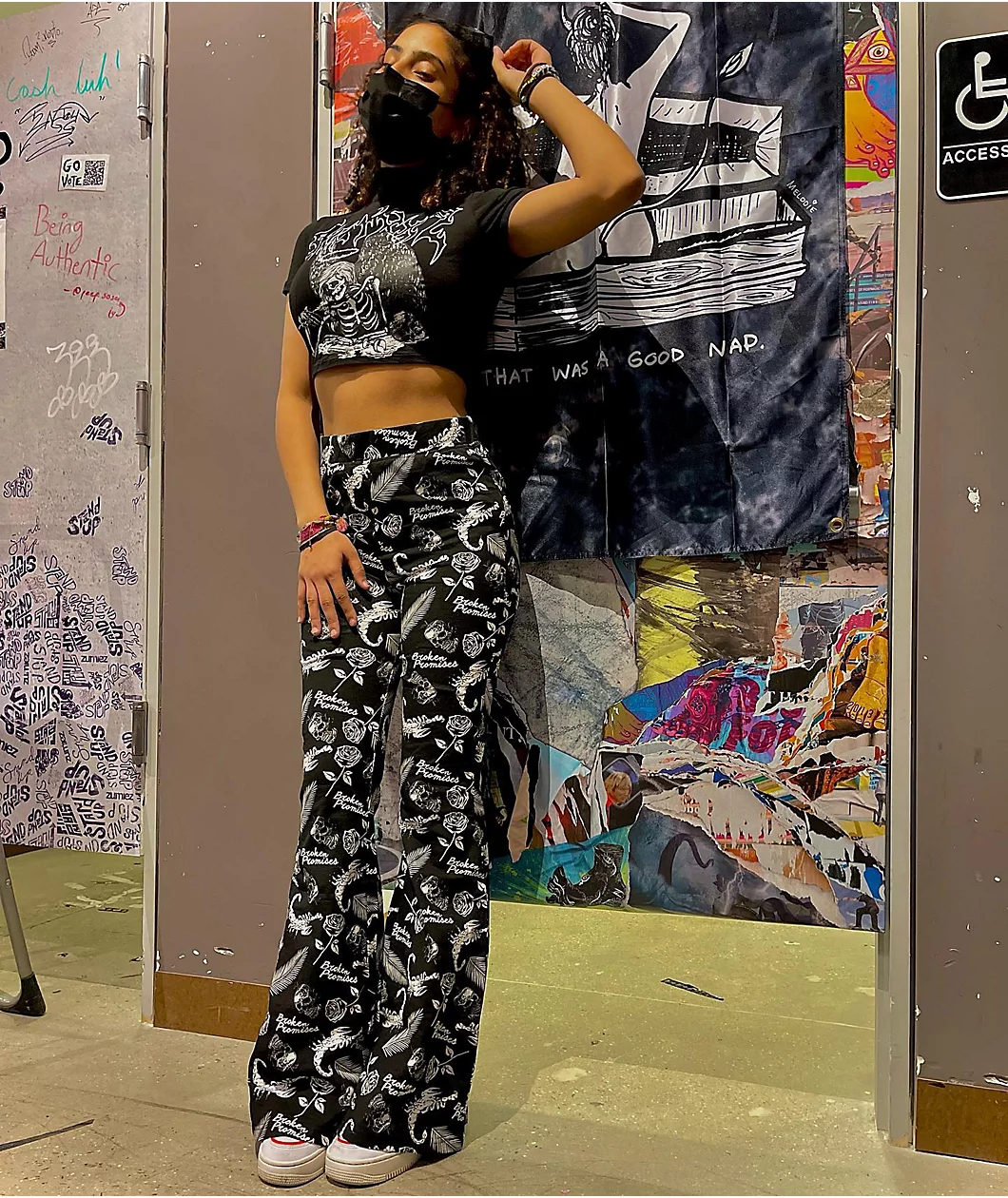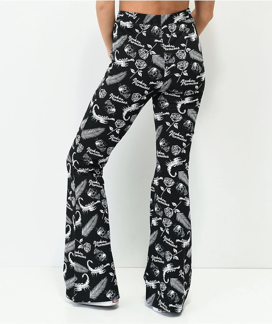 The Tropic Disaster black flare pants from Broken Promises have a tight, high-waisted fit with wide leg openings and an elastic waistband that is sure to keep you comfortable. These stretchy, flared pants come in a sleek black colorway, outfitted with white sublimated graphics of scorpions, palm tree leaves, roses, skulls, and the Broken Promises script throughout.