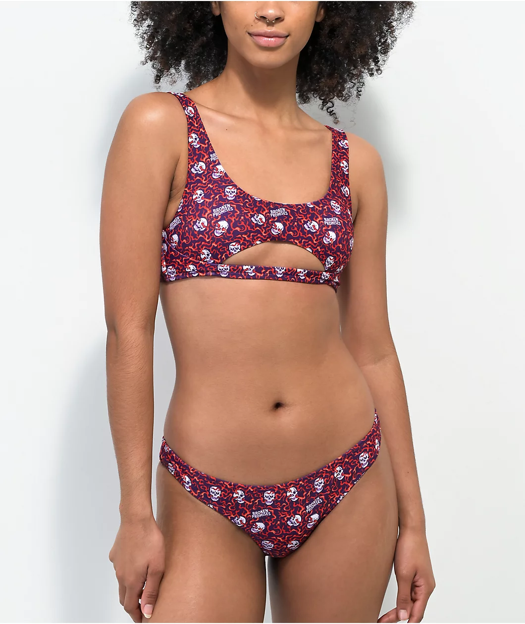 The Trouble In Paradise bikini bottom from Broken Promises come in a cheeky silhouette construction, and features a purple colorway with orange flames and skulls printed throughout.