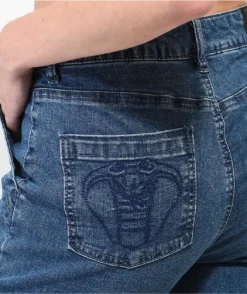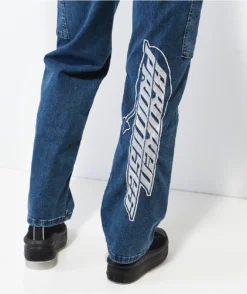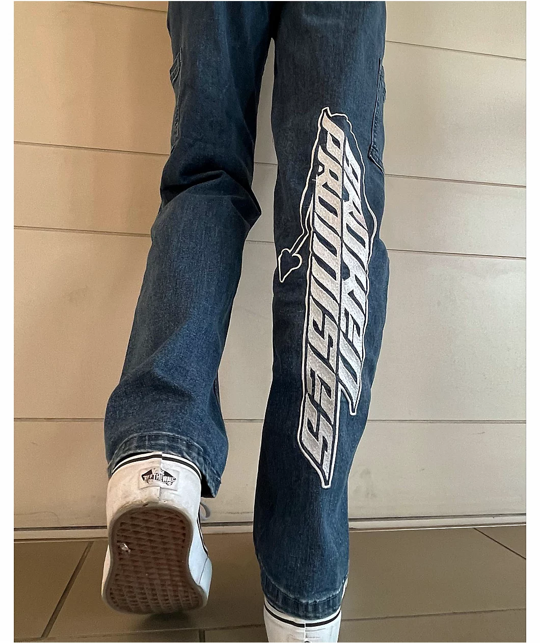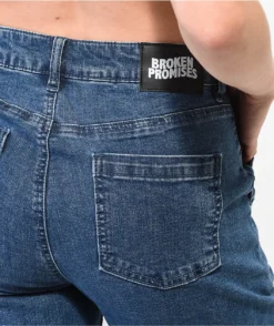 The Y2K cargo jeans from Broken Promises come in a medium blue washed denim construction offering a versatile staple piece to any wardrobe. These baggy cargo pants feature embroidered detailing on the back left pocket, depicting a viper’s head in a dark blue, as well as brand logo text on the back right thigh in white for contrast. These cargo denim jeans come complete with two front hand slash pockets, as well as two open cargo pockets for additional space.