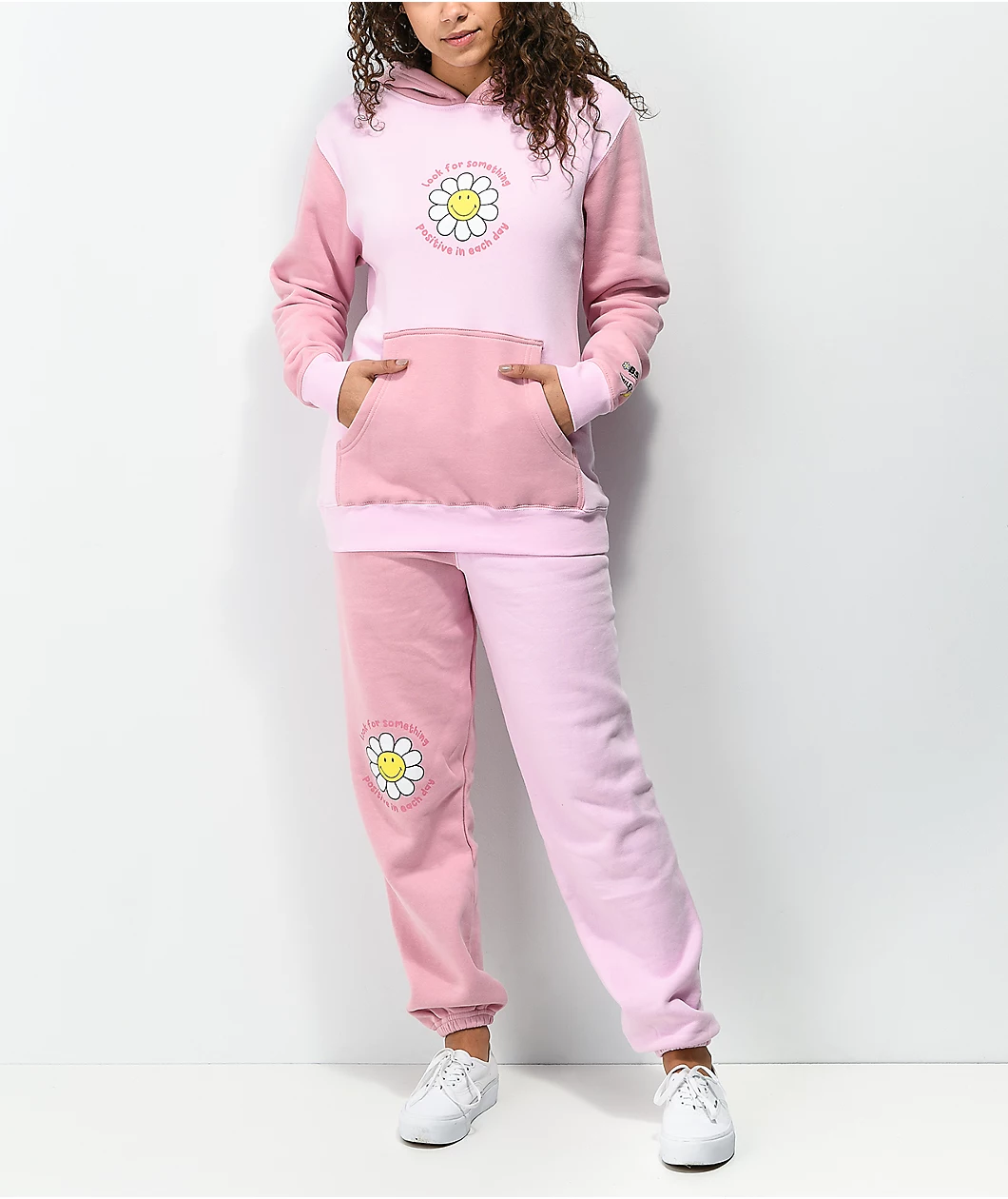 Add an optimistic pop to your outfits with the Positive pink colorblock sweatpants from By Samii Ryan x Smiley! Half salmon and half blush, these pink-tinted pants will lend a lively tone to any ensemble they’re included in, while their fleece-lined interiors and stretchy waistband and cuffs keep them warm and comfortable. Screen-printed daisies with smiley faces in their centers sit on the left hip and right knee, encircled by script reading “Look For Something Positive In Each Day”, perfect for adding some upbeat pizazz to your laid-back looks.