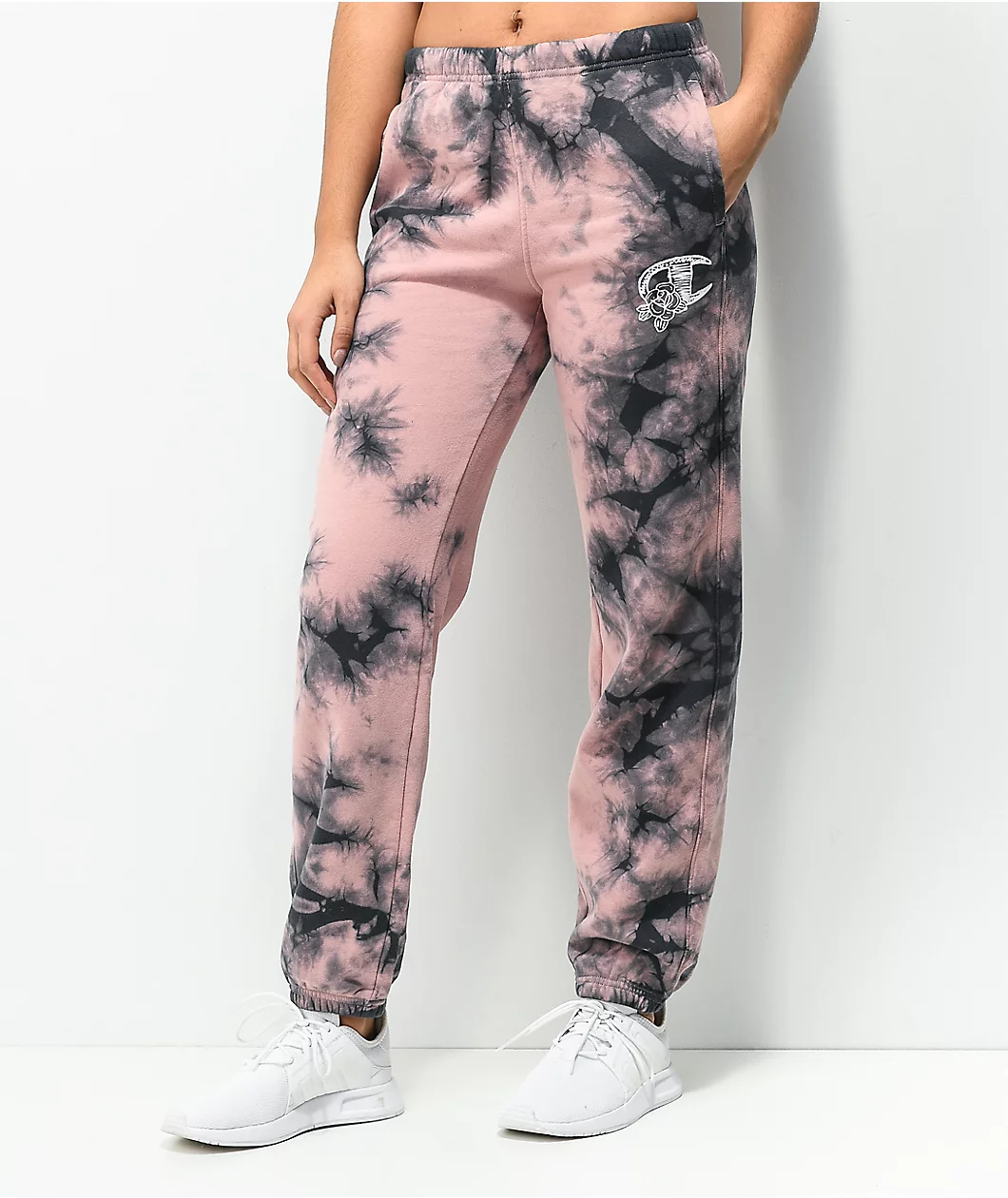 Warmth, comfort, and cool colors collide in Champion’s Boyfriend Fit pink and black galaxy dye sweatpants! These sweats feature a relaxed, loose-fitting silhouette, with a drawstring-adjustable elastic waistband and elastic cuffs giving them a bit of structure, while the fleece-lined interiors and cotton-polyester construction keep them cozy. Pastel pink and black shades swirl together throughout the sweats, offering up a pop of punchy color, with a screen-printed Champion logo embellished with rose outlines situated on the left hip.