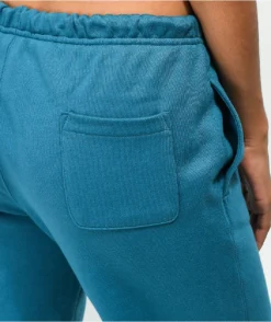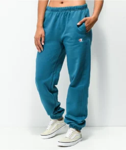 The Champion Reverse Weave boyfriend fit teal sweatpants have a loose, oversized silhouette, with two onseam hand pockets and a rear right patch pocket. These athletic sweats have a double needled construction for longer lasting wear, and a reverse weave fabrication that helps to hold the sweats’ shape better over time.