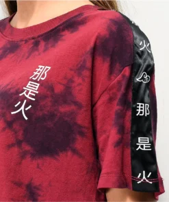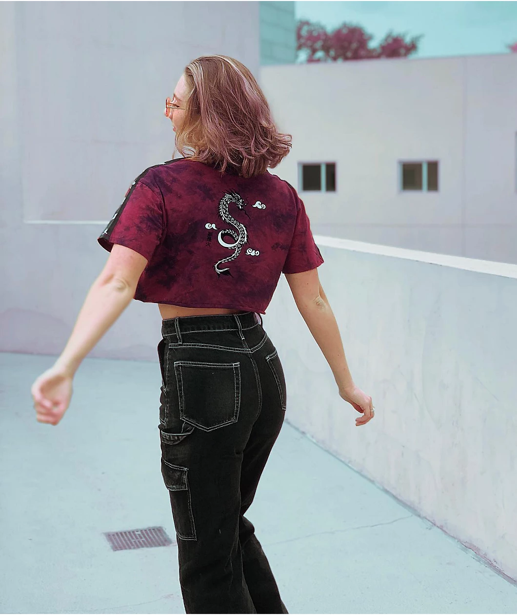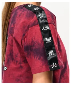 Complete your unique style with the Kipsy Tape red tie dye crop t-shirt from Empyre. This crop tee comes with a red and black tie dye wash throughout, while the left chest features white vertical lettering. The sleeves are adorned with black satin tape with matching white symbols and the back is finished off with a flocked black and white dragon graphic for a fierce look.