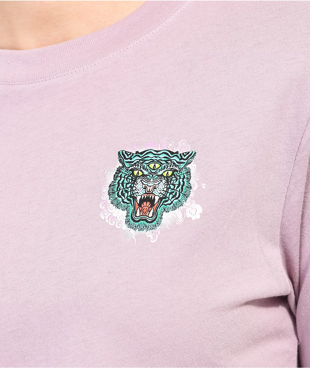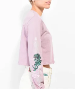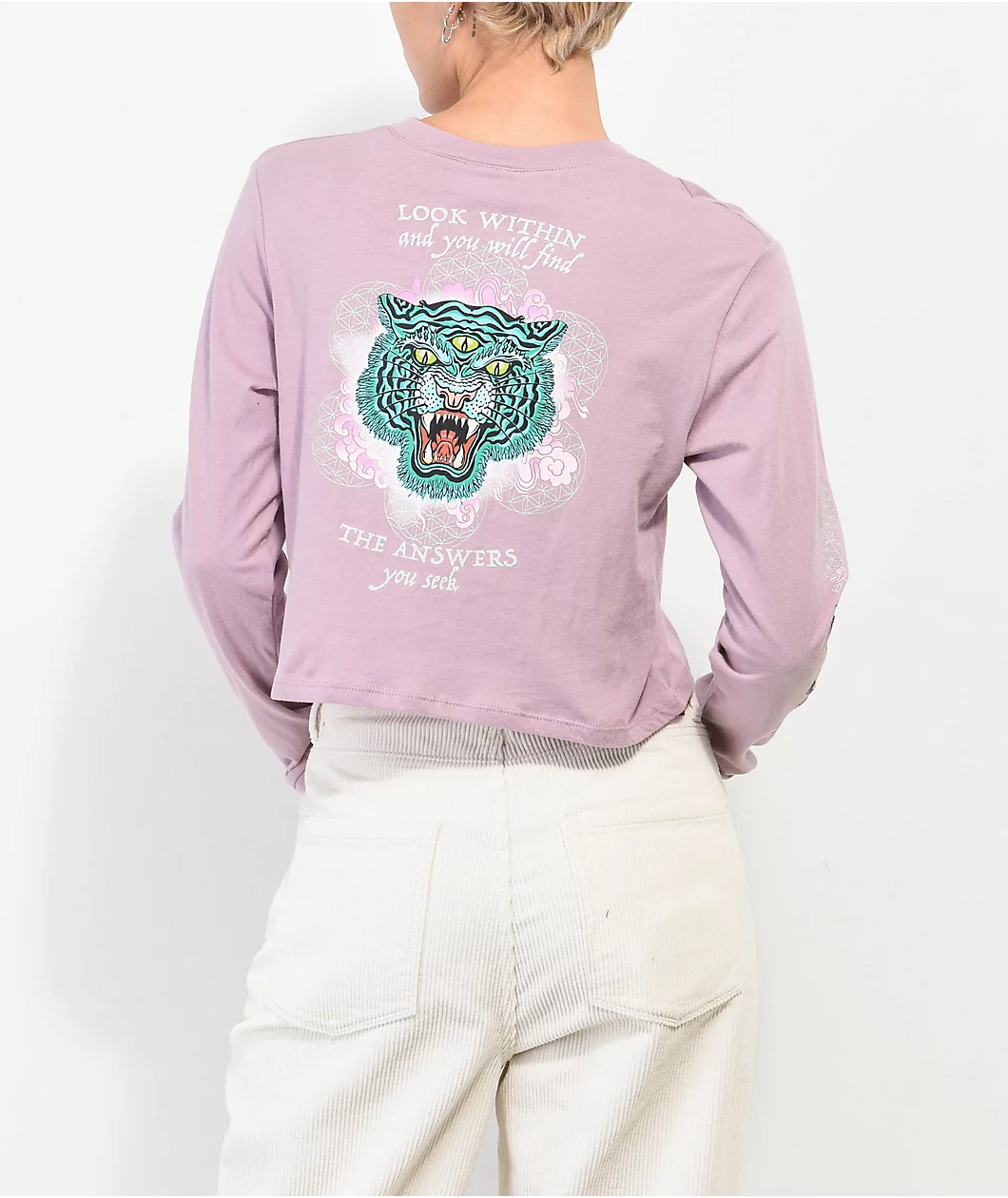 The Kode Tiger t-shirt from Empyre comes in a long sleeve, crop construction with a pink colorway. This cotton t-shirt has a screen-printed graphic of a tiger on the left of chest, back, and down both sleeves, as well as script on the back that reads, “Look within and you will find | The answers you seek.”