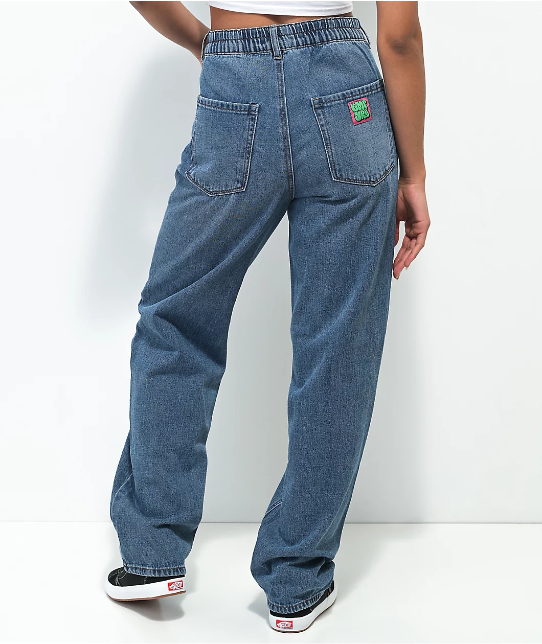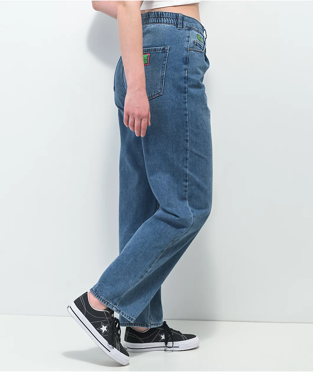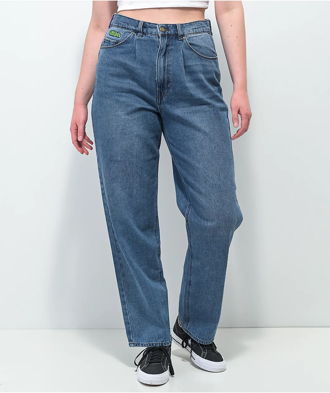 The Tori 90s medium wash denim skate jeans by Empyre come in a comfortable, loose fit, perfect for a skate session or everyday wear. These loose jeans, made from a durable, medium wash denim, are reminescent of 90s trends with a wider leg width and a high waisted sillhouette.