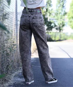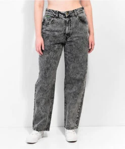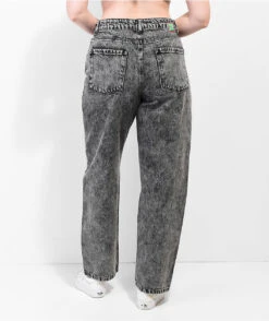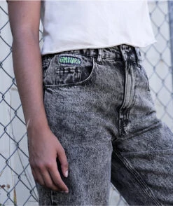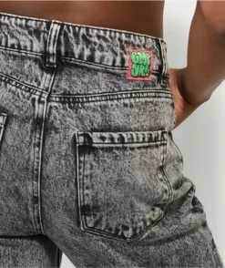 Add some 80s style to your wardrobe with the Tori skate jeans from Empyre in a black acid wash colorway. These denim jeans have a classic 5-pocket construction, adding a bit of color with an embroidered brand name in green on the front right hip; completing the look with a brand tag on the back right hip in pink and green accents.