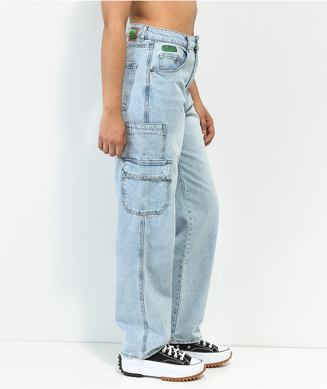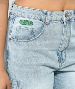 The Tori Empyre skate jeans have a loose fit and light blue wash for a 90s inspired look and fit. These loose skate pants have a standard 5-pocket configuration, as well as two sleeve pockets and button flap cargo pockets at each thigh, and are finished with custom brand embroidery at the right hip and a brand patch at the back of the waistband.