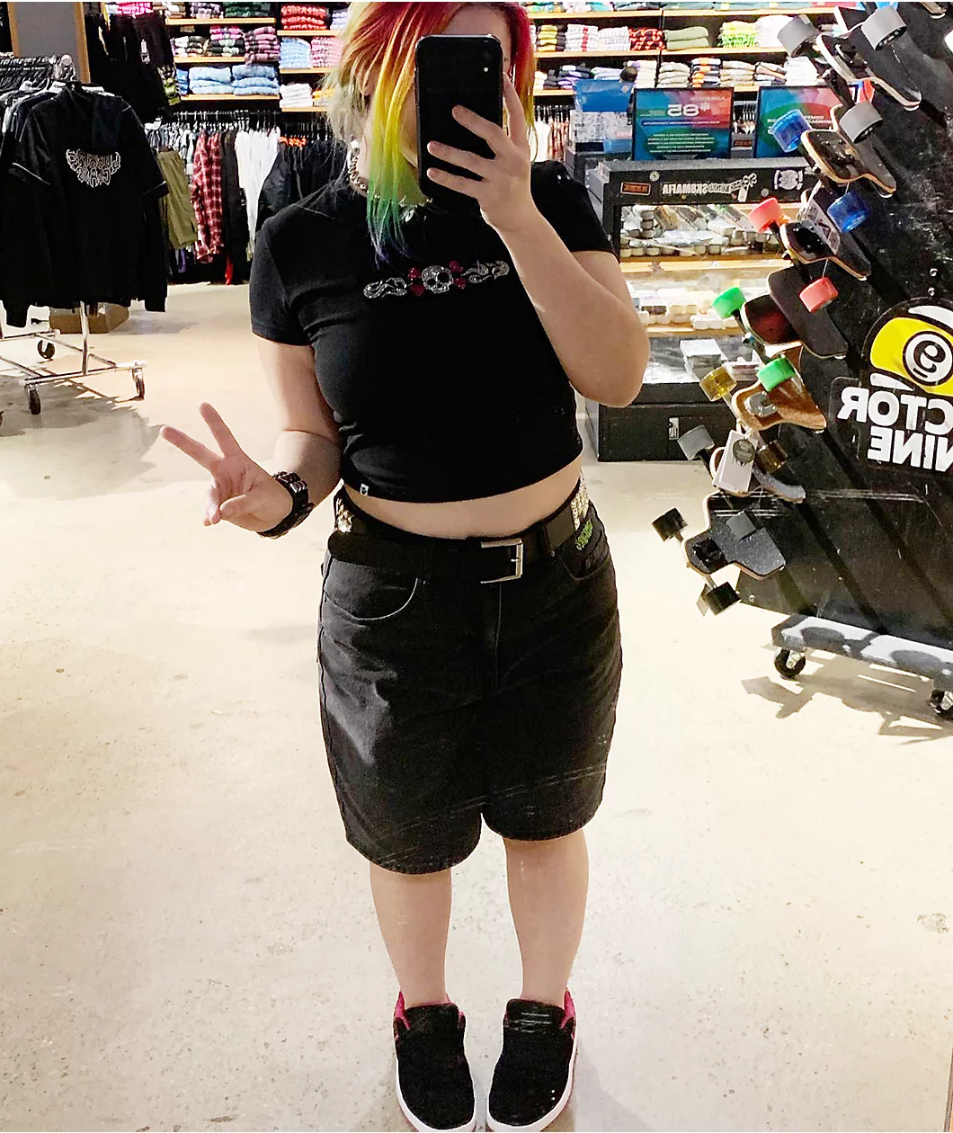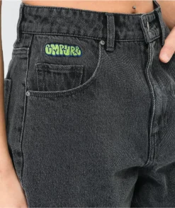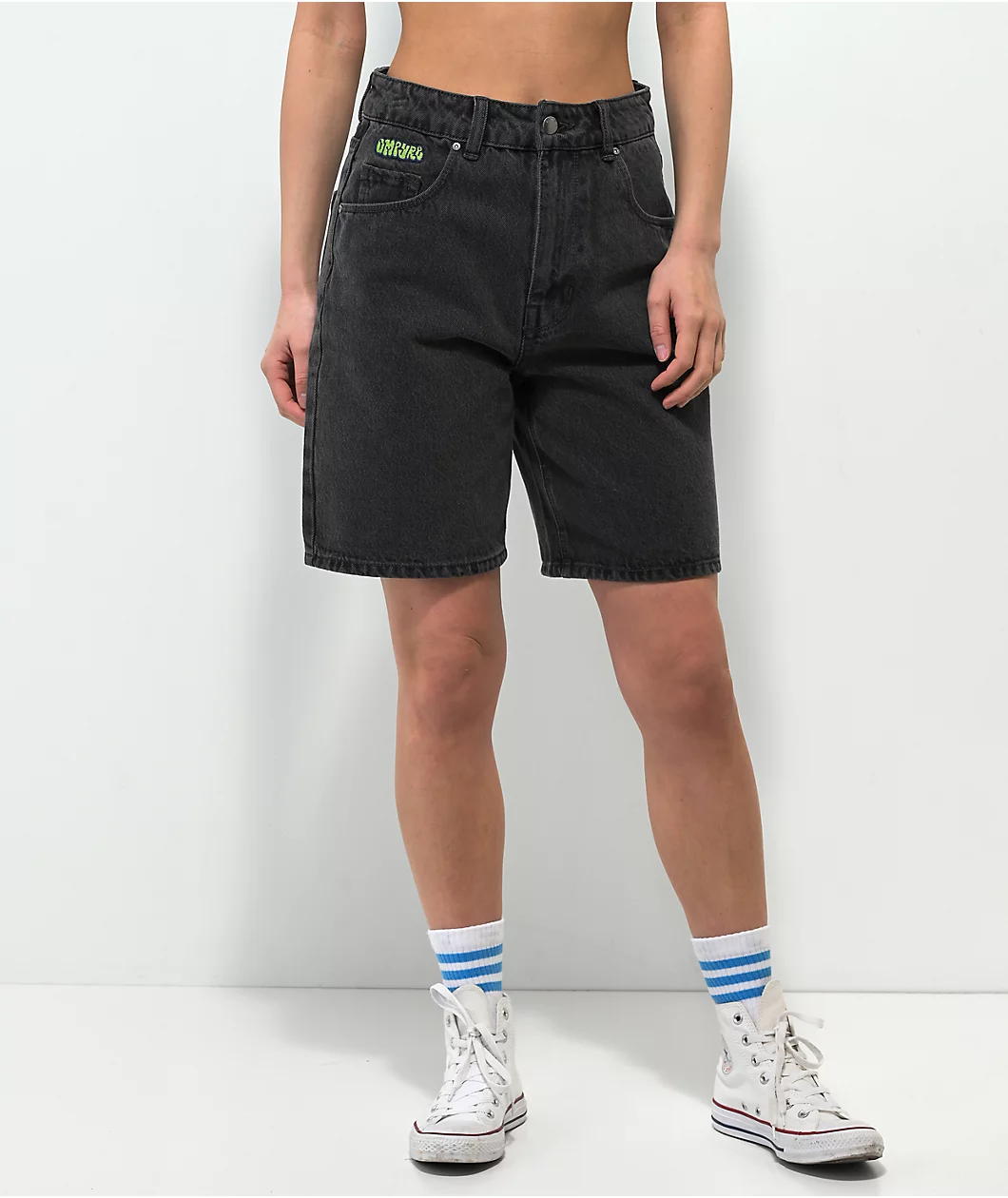 Empyre’s Tori skate shorts have a loose fit and a black wash denim construction. They’re stocked with two slash hand pockets, two seat pockets, an additional coin pocket, and zipper fly. Embroidered on the right hip is a graffiti-style Empyre script, while an Empyre patch sits above the right seat pocket.