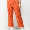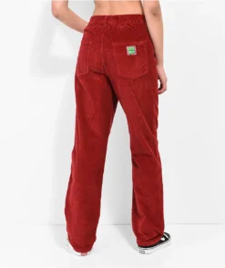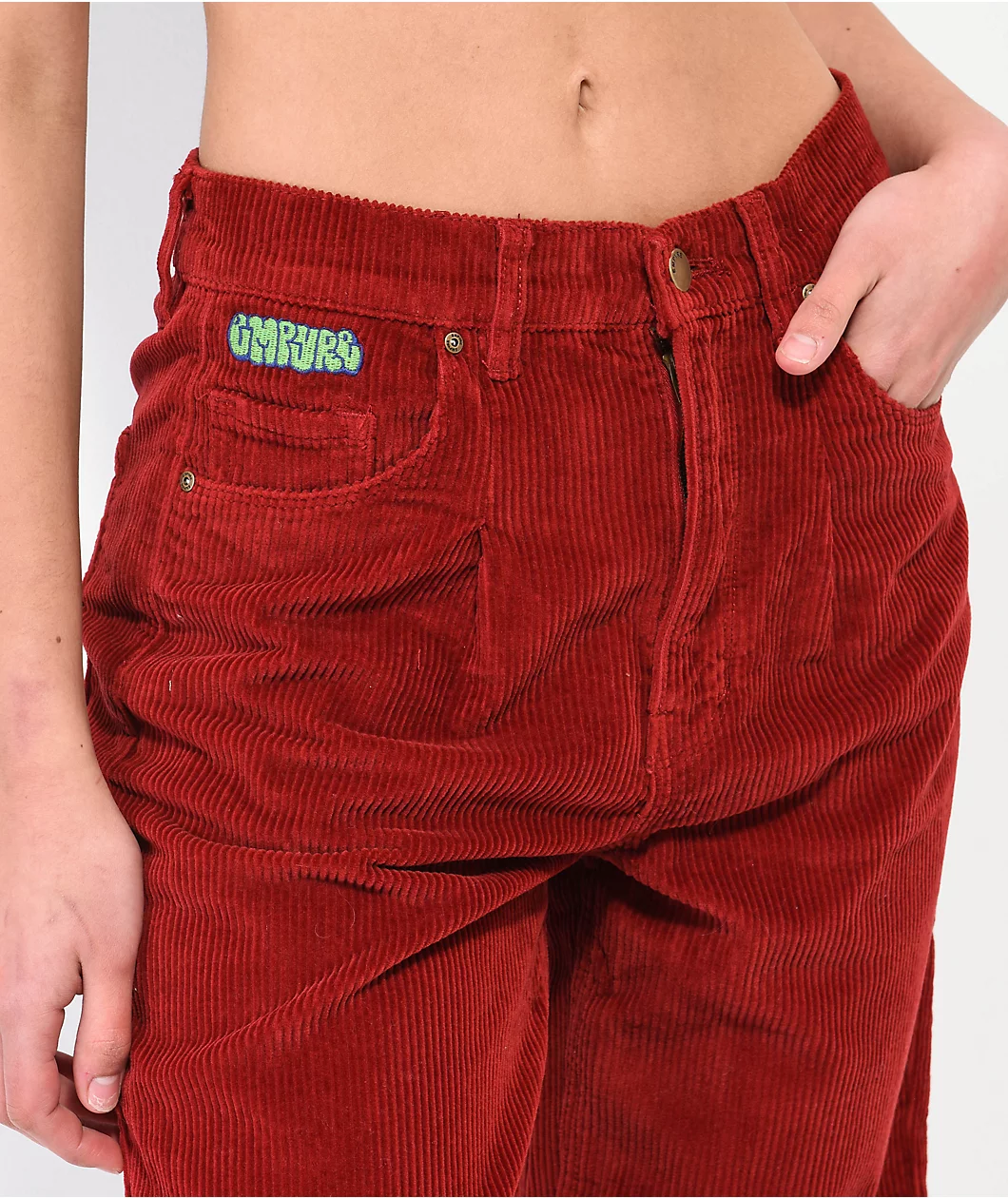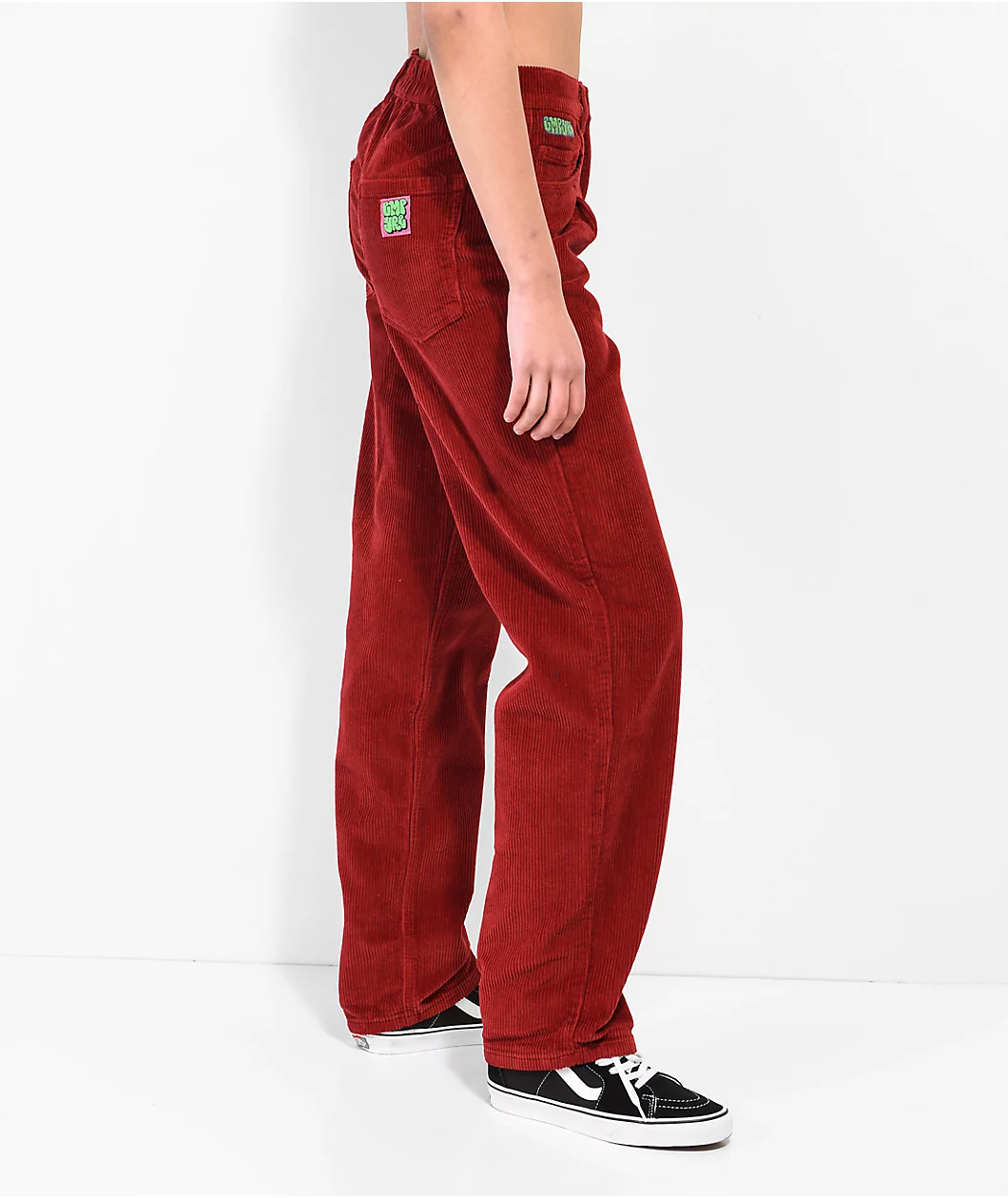 The Tori skate pants from Empyre come in a pleated corduroy construction with a wine colorway, adorned only on the front right pocket with green brand script. These comfy skate pants feature classic button-and-fly closure as well as a 5-pocket construction for easy organization; perfect for casual wear or as a colorful statement piece.