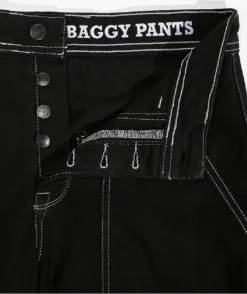 These 90s-inspired X-Tra jeans from Homeboy have a black denim construction with contrasting white seams, and a high-waisted, baggy fit that tapers from the knee to the leg opening, cutting off at the ankles. They have the standard 5-pocket configuration, a hammer loop on the left thigh, and another pocket on the right thigh. These loose Homeboy work pants are finished off with a rainbow-colored tab on the right seat pocket and a brand patch on the right thigh.
