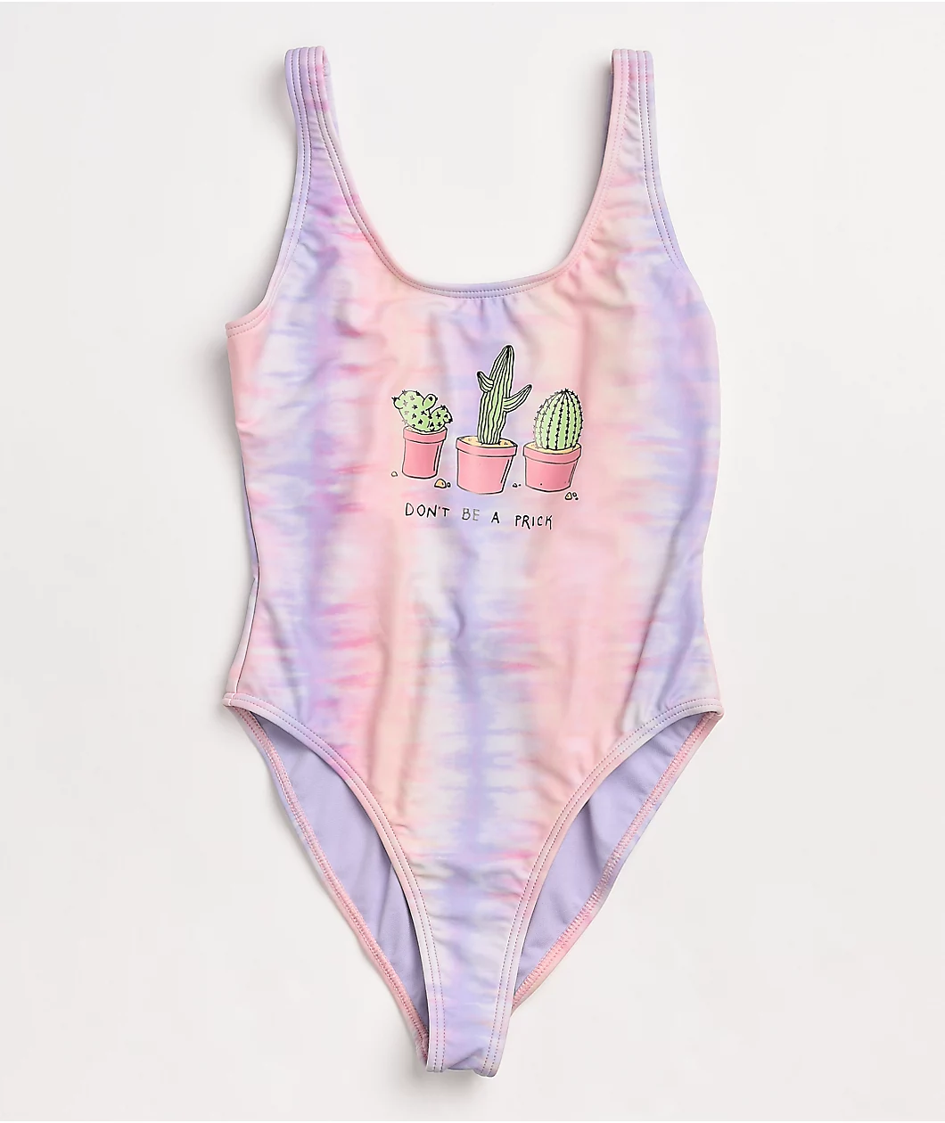 Grab a new look for this season with the Don’t Be A Prick pink and purple tie dye one piece swimsuit from JV by Jac Vanek! This striking one-piece features three cacti at the chest, with “Don’t be a prick” script underneath for some fitting humor. The pink and purple tie dye colorway gives any of your swim-related looks plenty of color, ensuring this thing belongs in any collection.