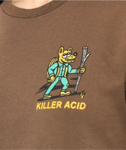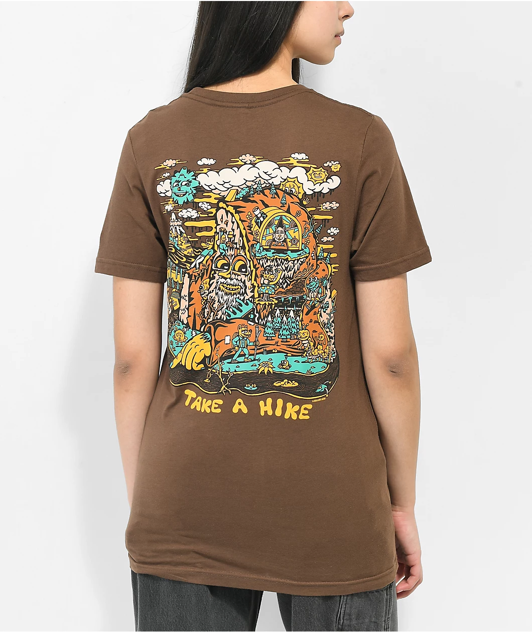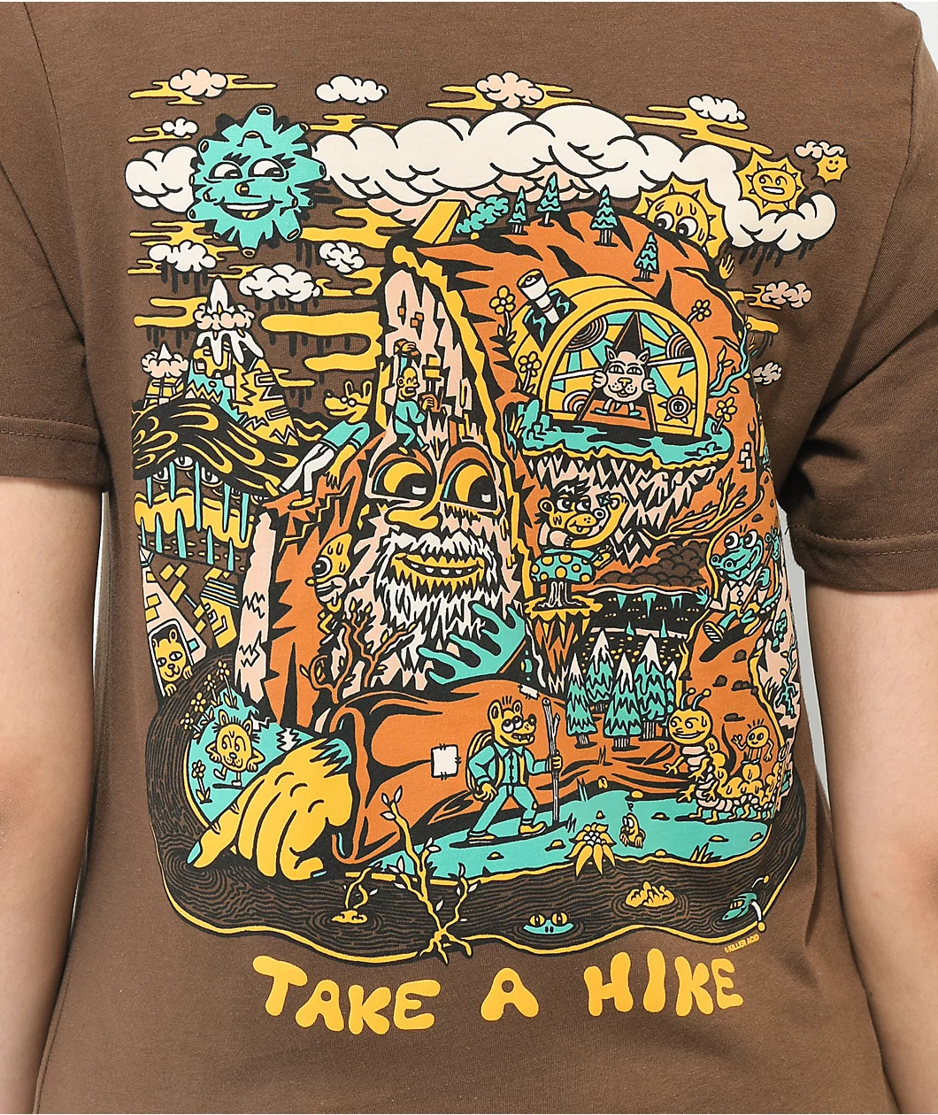 Made from soft, lightweight cotton, and featured with a crewneck collar and regular fit, the Take A Hike Killer Acid t-shirt has a classic look and feel that is easy to pair with a variety of tops and bottoms. This Killer Acid tee comes in chestnut brown with a screen-printed wolf graphic on the left chest, and the back expands on the motif with a busy mountain inspired graphic, and “Take a hike” text at the bottom.