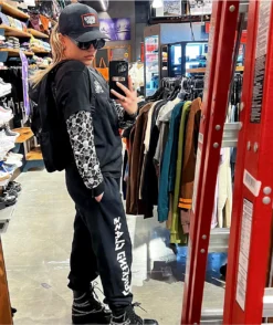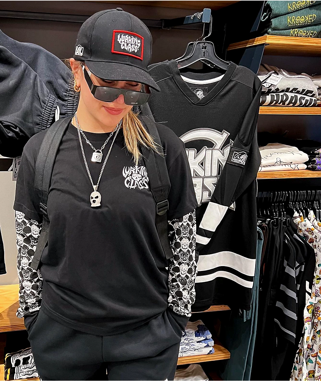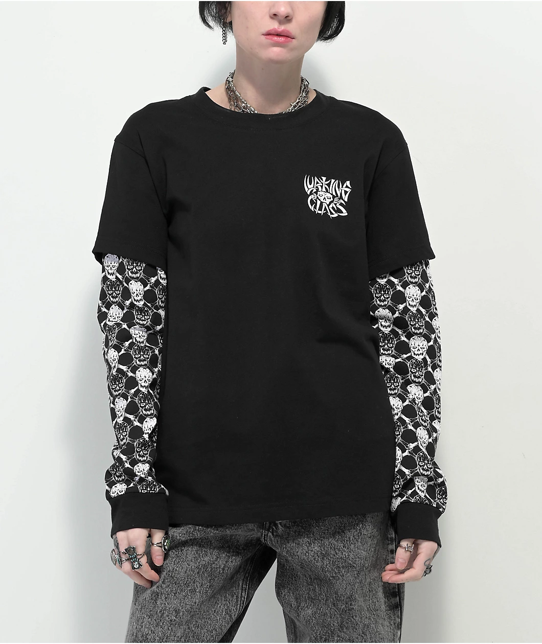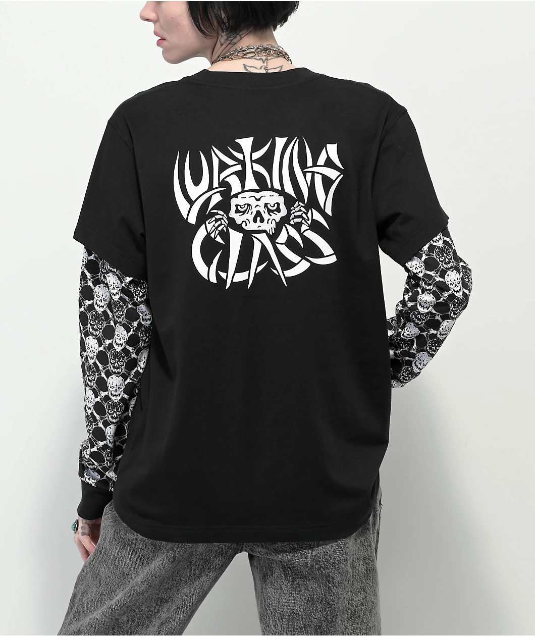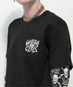 The Bones 2fer t-shirt from Lurking Class by Sketchy Tank features a black short sleeve layered over a black long sleeve, adorned with Lurker figures and skull-and-bones graphics down the sleeves. This cotton-poly t-shirt is the perfect statement piece for any outfit with an edgy look.