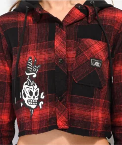 The Daggers hooded flannel shirt from Lurking Class by Sketchy Tank features a red and black plaid crop construction with a drawstring-adjustable hood and a patch pocket on the left of chest. Adorning the left side of this shirt is a small brand tag while the right boasts a screen-printed graphic of a dagger in a skull for a Shakespearean look.