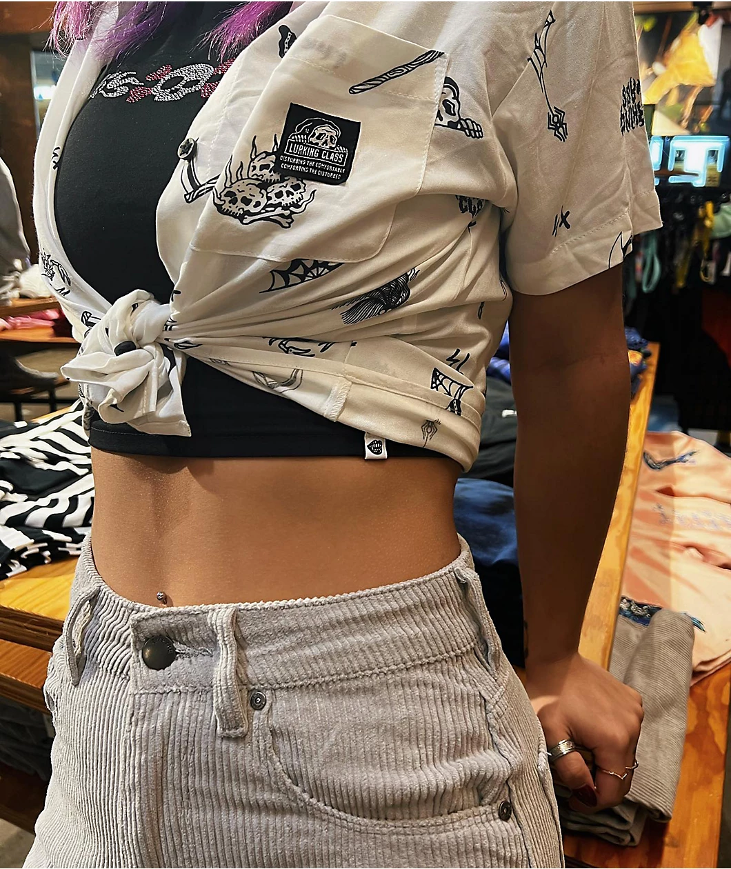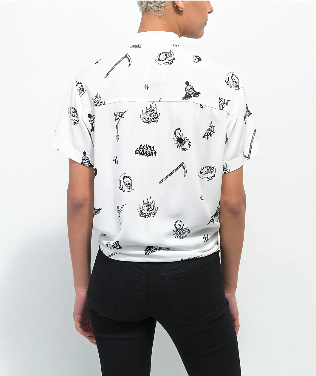 The Mixed short sleeve button up shirt from Lurking Class by Sketchy Tank comes in a white colorway with sublimated graphics throughout, like spiderwebs, grim reapers, and more. It has a turndown collar, straight bottom hemline, and a tie-front option, too, while its rayon construction makes the shirt flowy and lightweight.