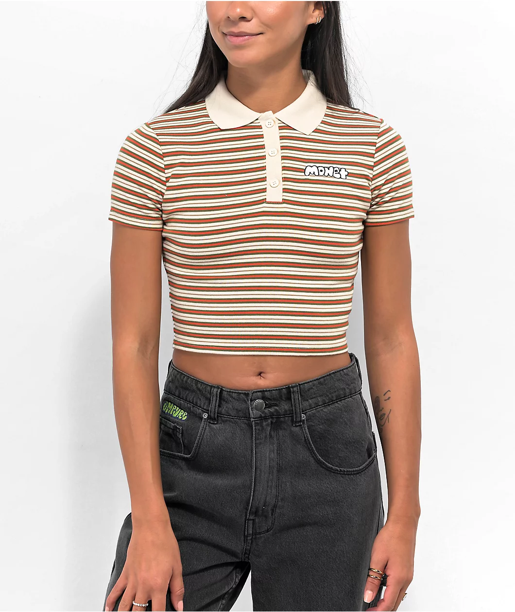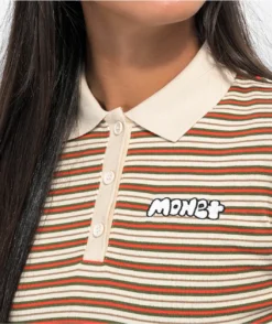 Monet offers the Madina Striped crop polo t-shirt in a tan colorway with accents of red, green, and brown in horizontal striping throughout. A turndown collar with a three button closure offers a classic look, while a slim, cropped fit adds a new age feel to the piece. The Monet logo can be seen embroidered left of chest, coming complete with a cotton-poly blend that offers comfort without sacrificing durability.