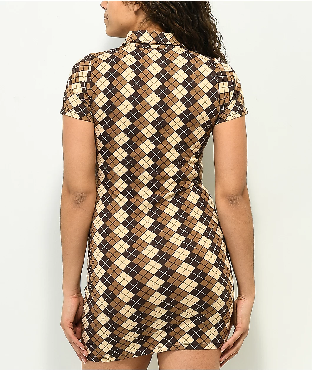 The Jeeves Bodycon Motel Dress comes in a brown colorway with an argyle pattern throughout and a tight, bodycon construction with a stretchy fit. This dress is perfect for dressing up or down featuring a four-button closure with a turndown collar, an above-the-knee straight hem, and short sleeves.