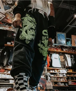 The Double Dragon NGOrder jogger sweatpants have a black colorway with large, lime green, screen-printed dragons on both thighs, as well has a woven brand patch at the front of the waistline. These NGOrder sweats have a relaxed fit through the thigh, tapering at the ankle, and a mid rise, elastic waist.