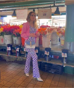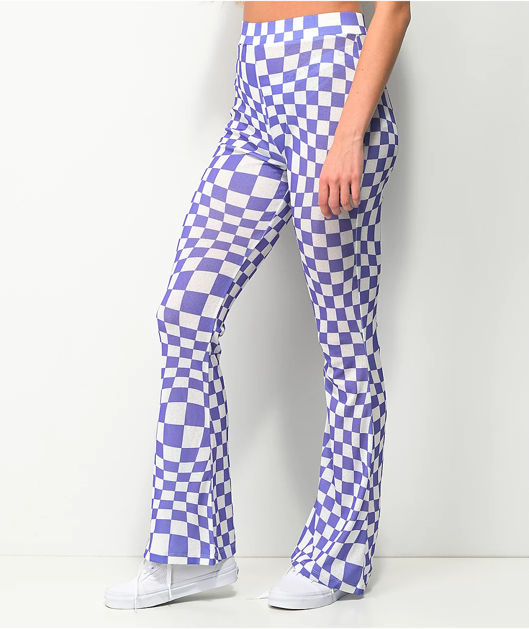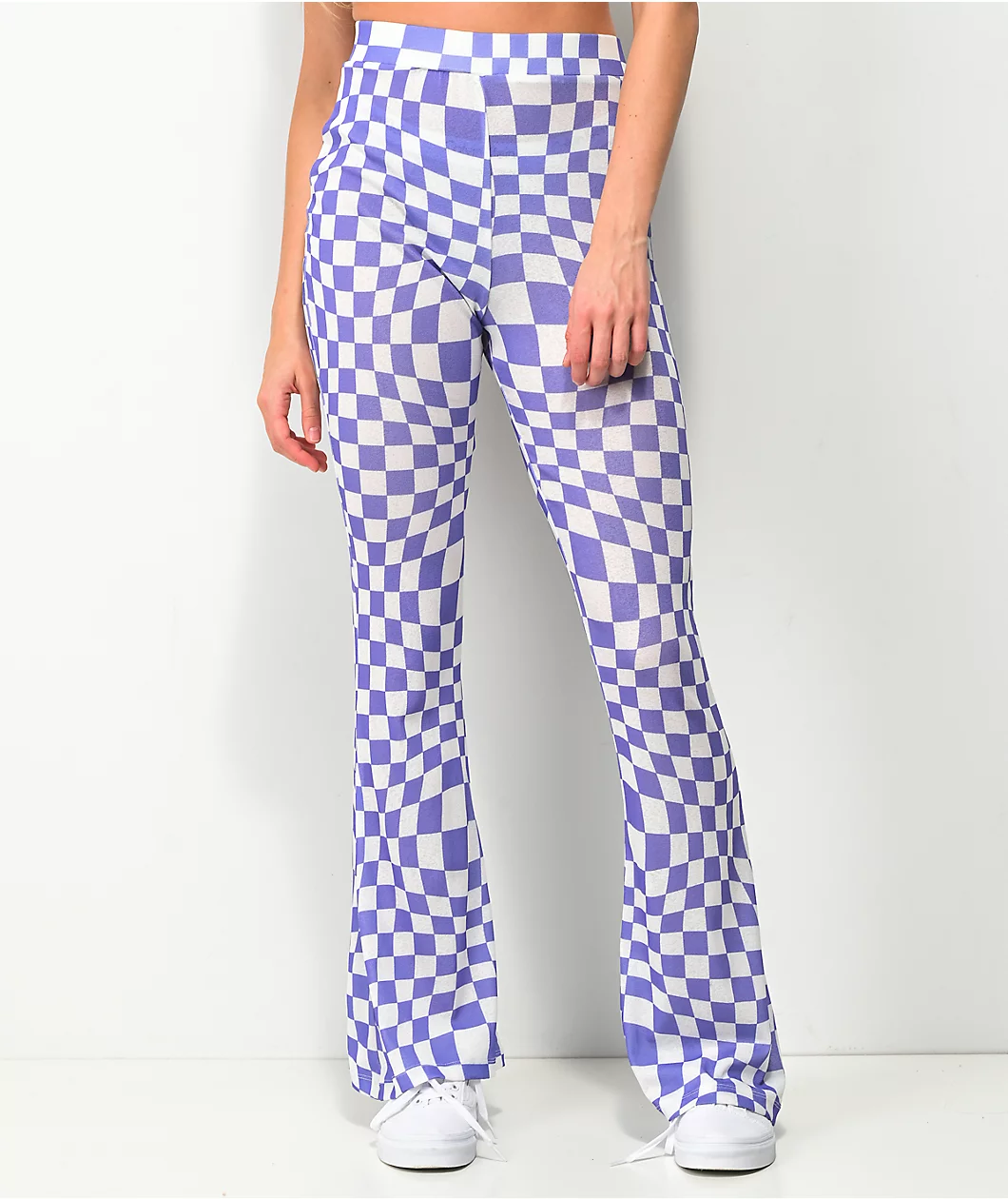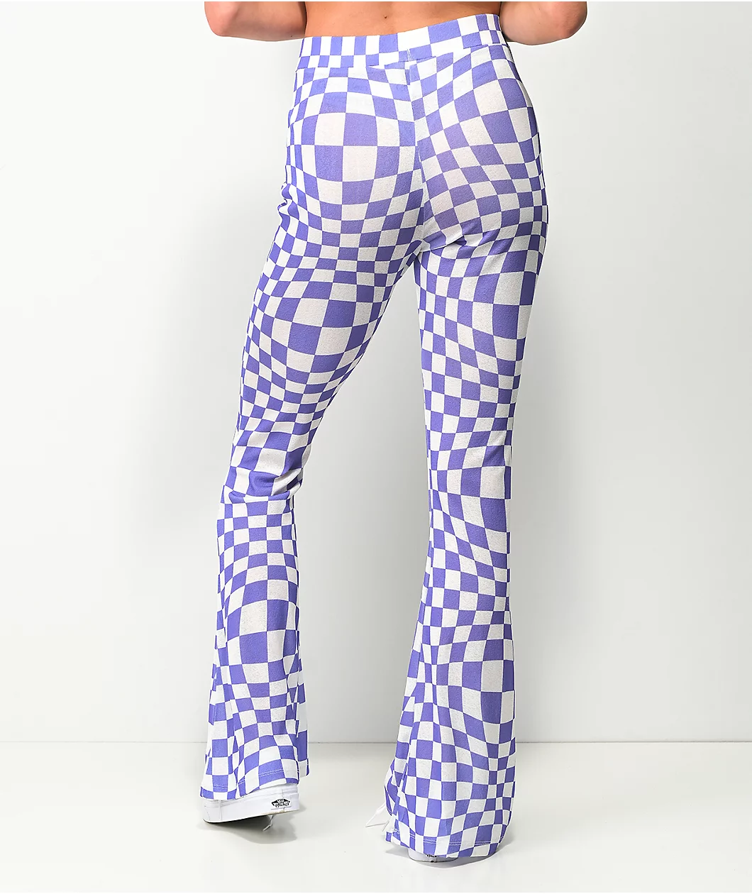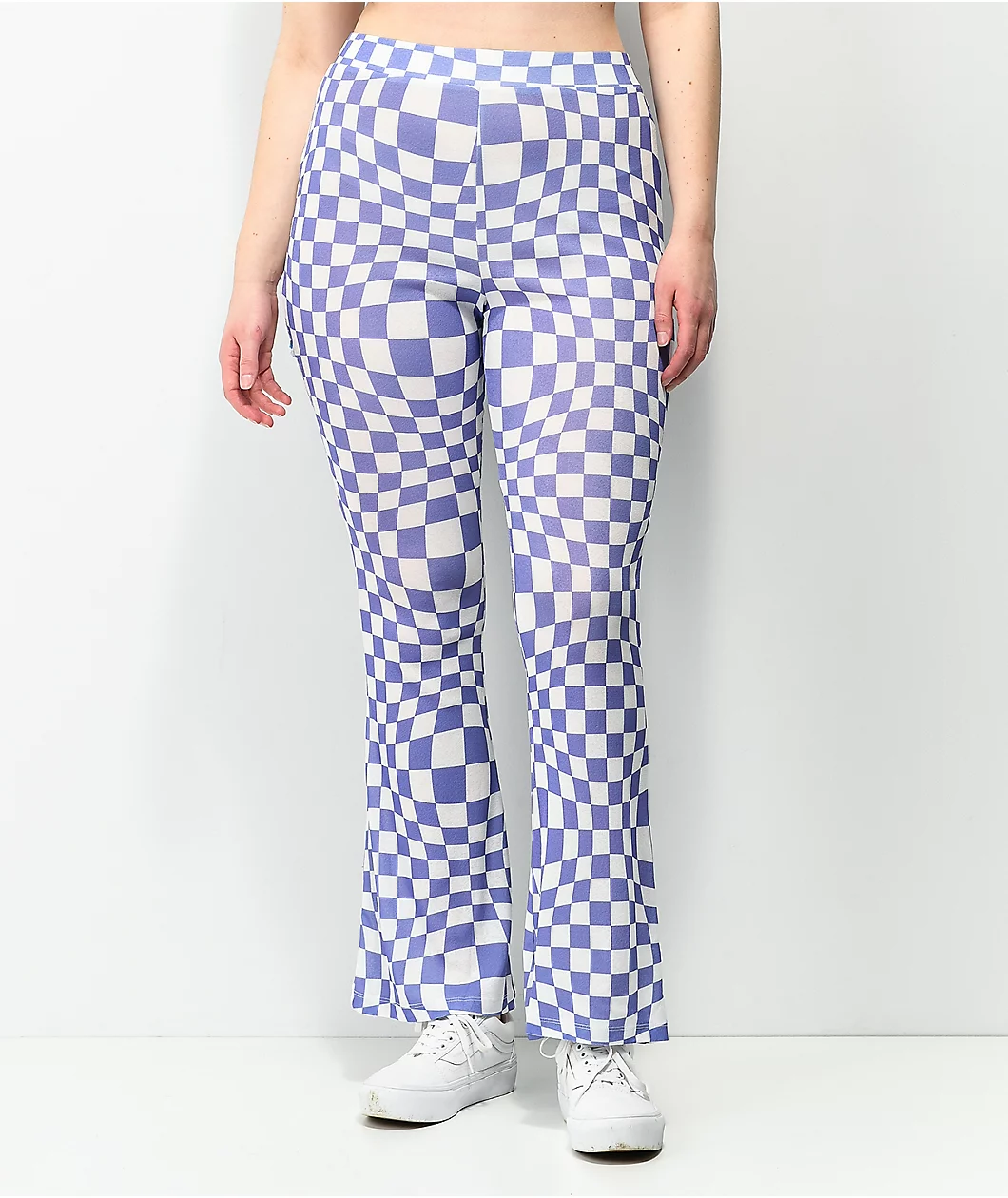 Revamp your wardrobe with NGOrder’s Warped purple and white flare pants! These super stretchy, poly blend pants have a high-waisted fit and a flared leg silhouette. Throughout the entirety of the pants is a warped purple and white checkered pattern, giving them a trippy, vintage feel but with a modernized update.