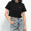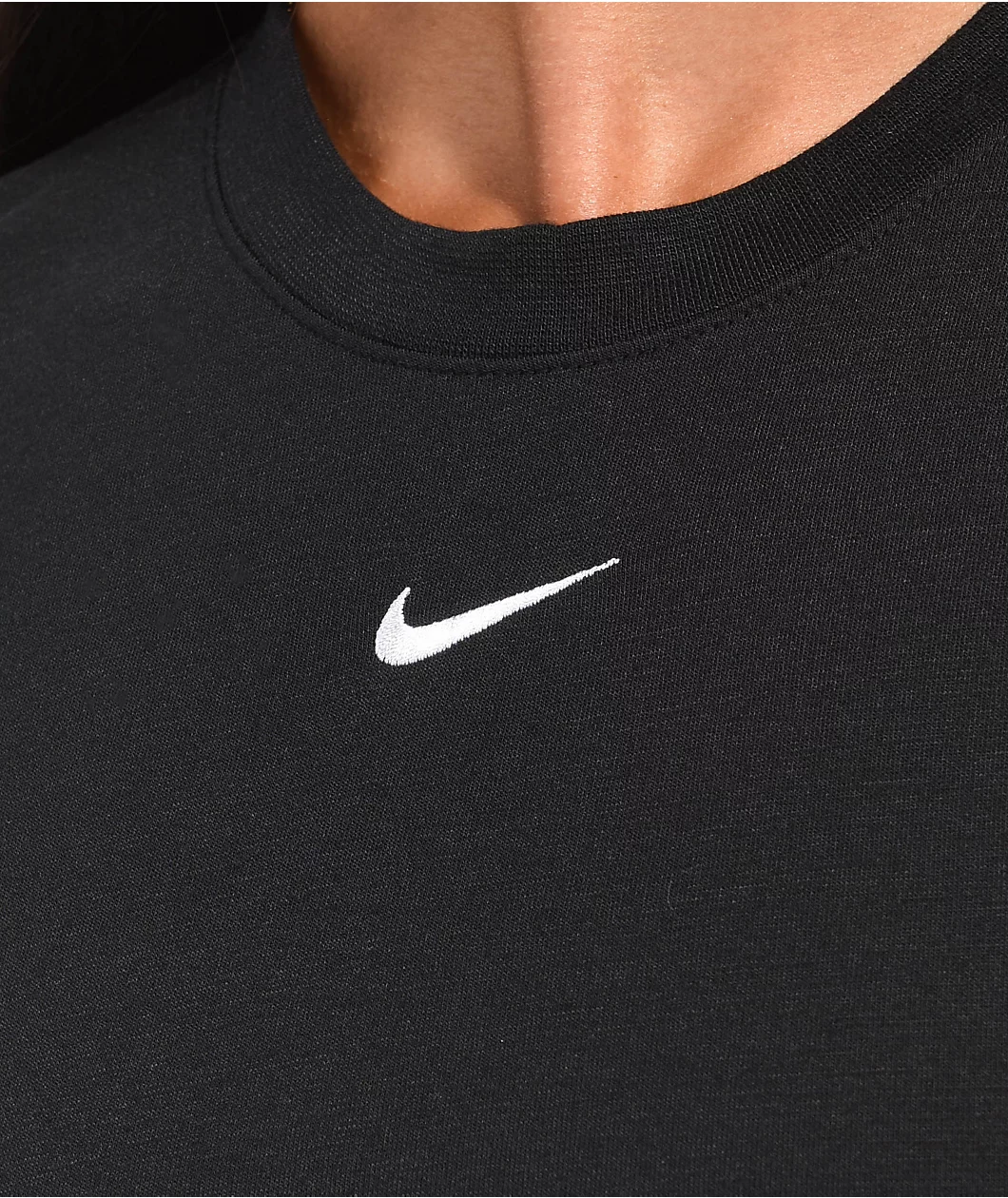 This black t-shirt from the Essentials collection of Nike Sportswear comes in a fitted, crop construction with a white embroidered Swoosh logo on the chest. This shirt is made of a modal, polyester, and spandex blend and features a slim fit for all day comfort.