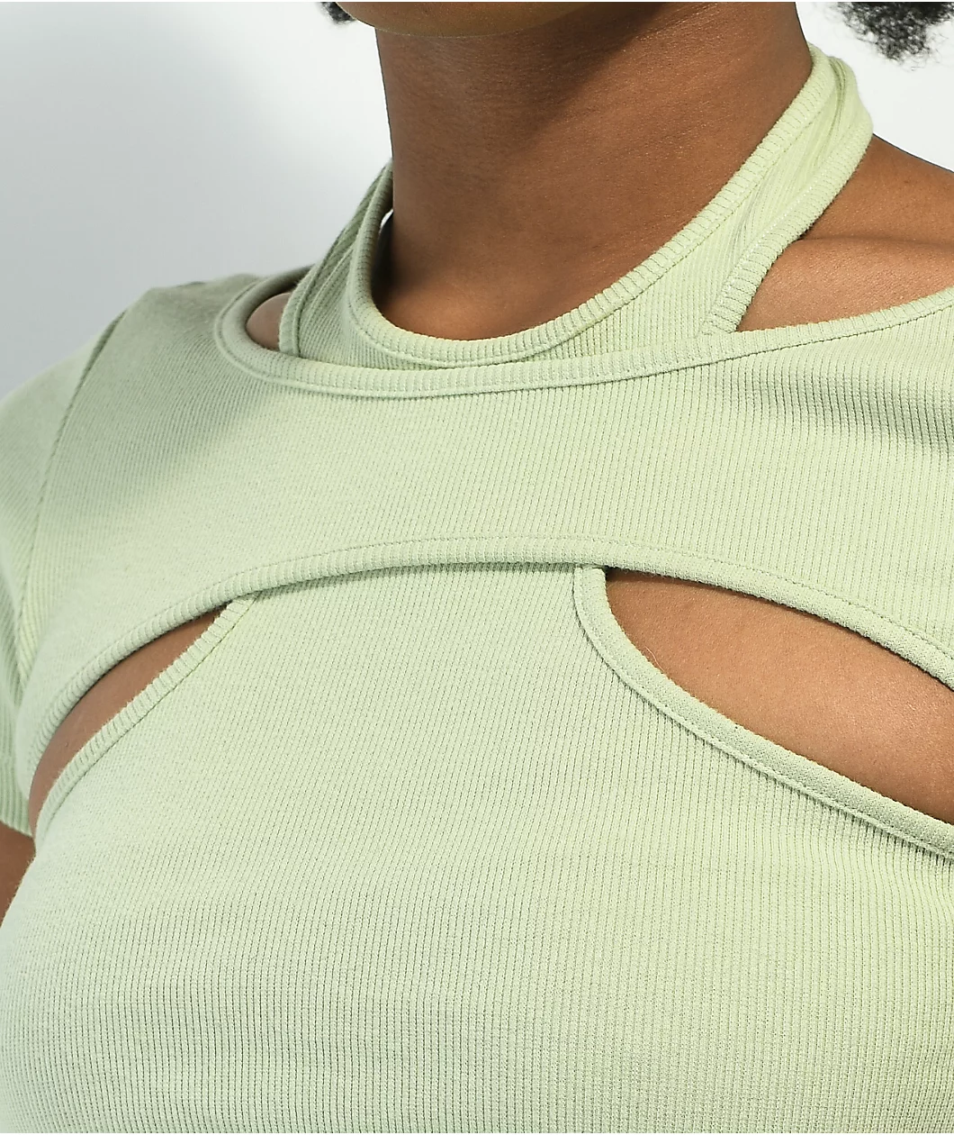 The Leia top from Ninth Hall comes in a layered, cropped construction with short sleeves and cut outs visible on the upper chest near the shoulders. This shirt has a ribbed look made out of a stretchy cotton-spandex blend for the utmost comfort and style.