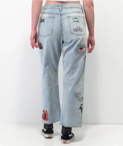 Add an artistic twist to your legwear rotation with Ninth Hall’s Sire printed light blue denim dad jeans. These jeans are constructed from light-wash cotton denim, with a relaxed, straight-legged silhouette and five-pocket configuration keeping them comfortable and classic. Screen-printed doodles depicting flowers, eyes, butterflies, script reading “Sick”, and a plethora of other phrases and pictures adorn the legs, lending the jeans some DIY-inspired detailing.