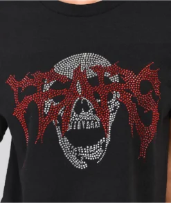 The Rhinestone Skull t-shirt from Personal Fears is made of 100% cotton and comes in a black colorway with a unfinished crop cut on the bottom hem. This shirt is adorned on the front with a rhinestone graphic of red “Fears” script over a skull.