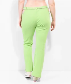 The Chained Up pants from Ragged Priest come in a bright green colorway, with a stretchy cotton blend fabrication. The ribbed elastic pants feature a slim fit, with flared leg openings. Hip cutouts along the elastic waist provide a unique silhouette, while a silver chain belt completes the look.