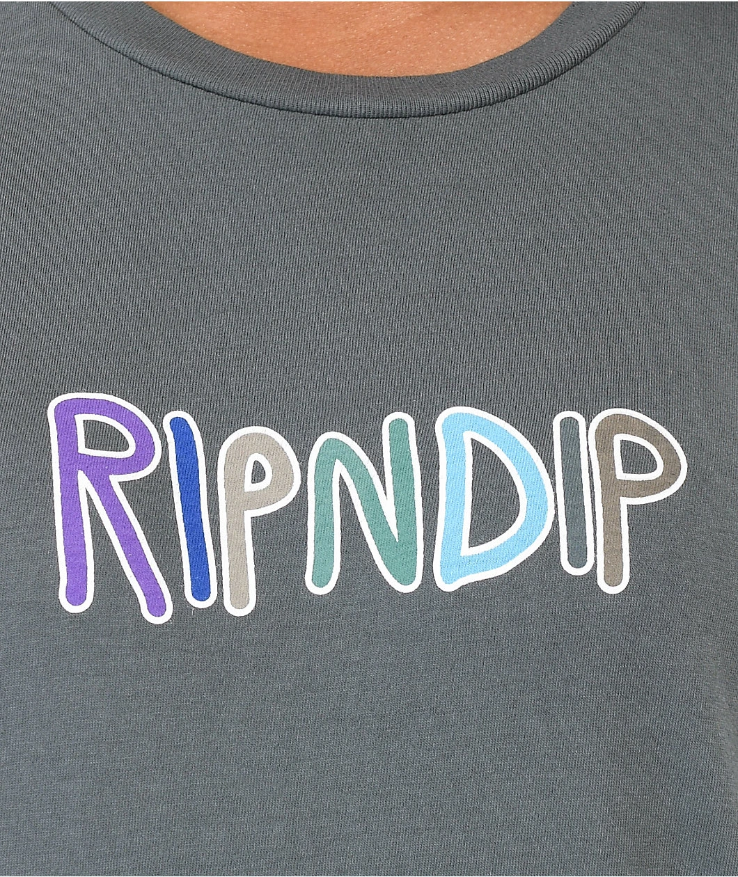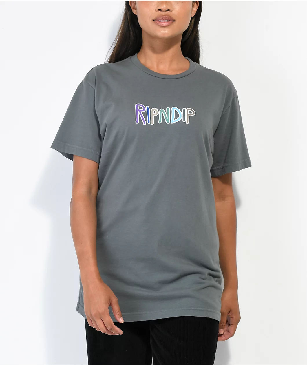 The OG Prisma RIPNDIP t-shirt is featured in a charcoal colorway with colorful screen-printed brand text across the chest. This RIPNDIP shirt has a baggier, boyfriend fit, a crewneck collar, and a super soft, super comfortable cotton construction.