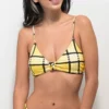 The SWIXXZ Butterfly triangle bikini top comes in a grey colorway and is outfitted with screen-printed yellow and purple butterfly graphics on the cups. This bikini offers moderate coverage, light support, and has additional padding in the cups, along with string ties for the neck and back.