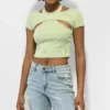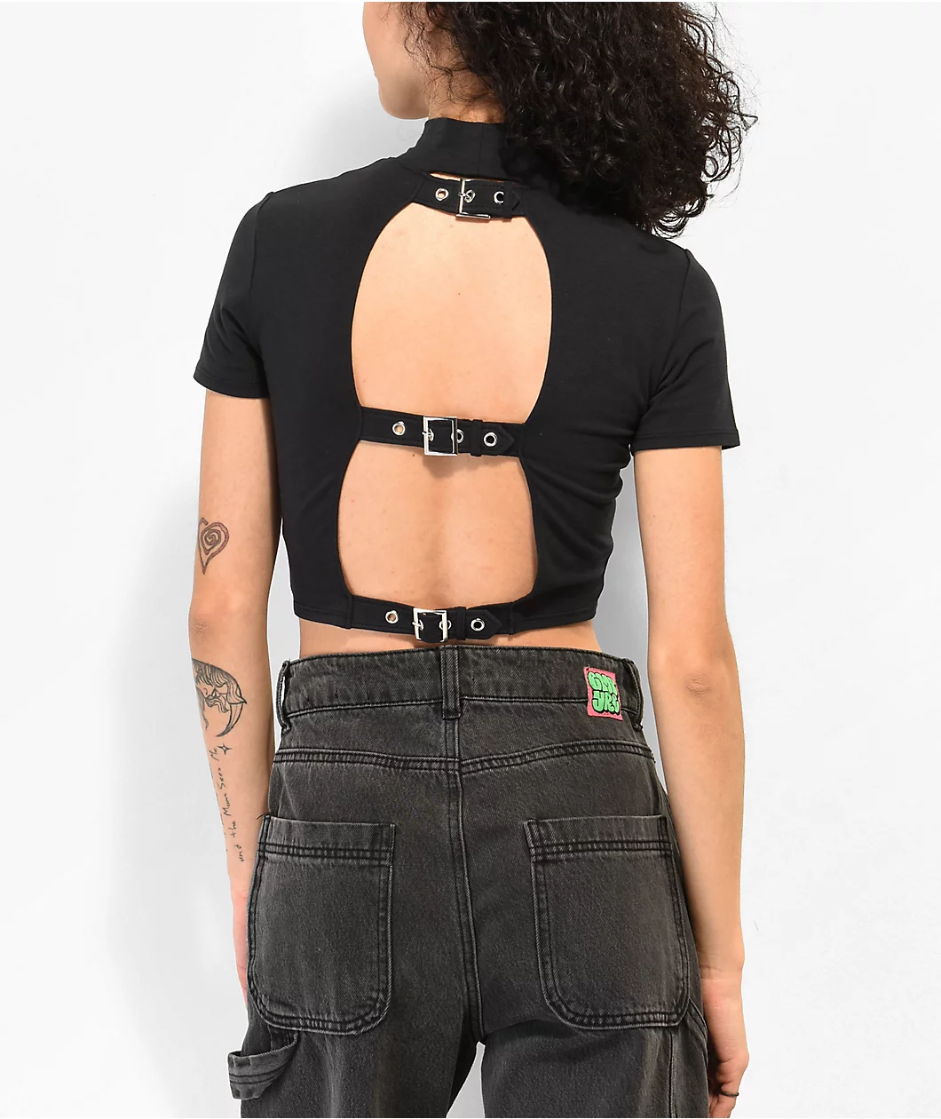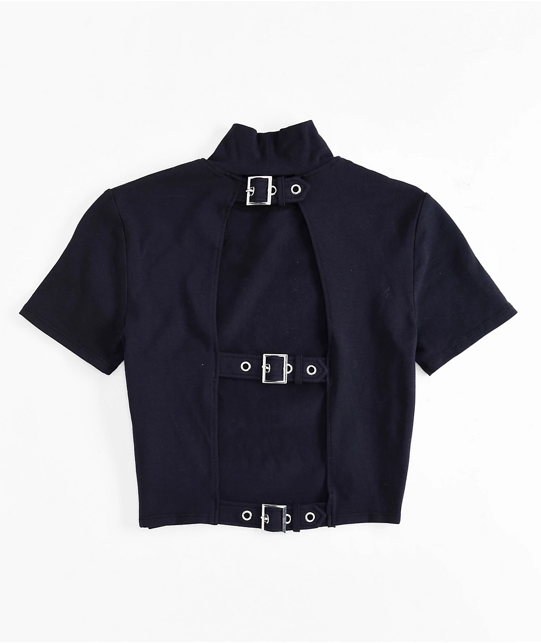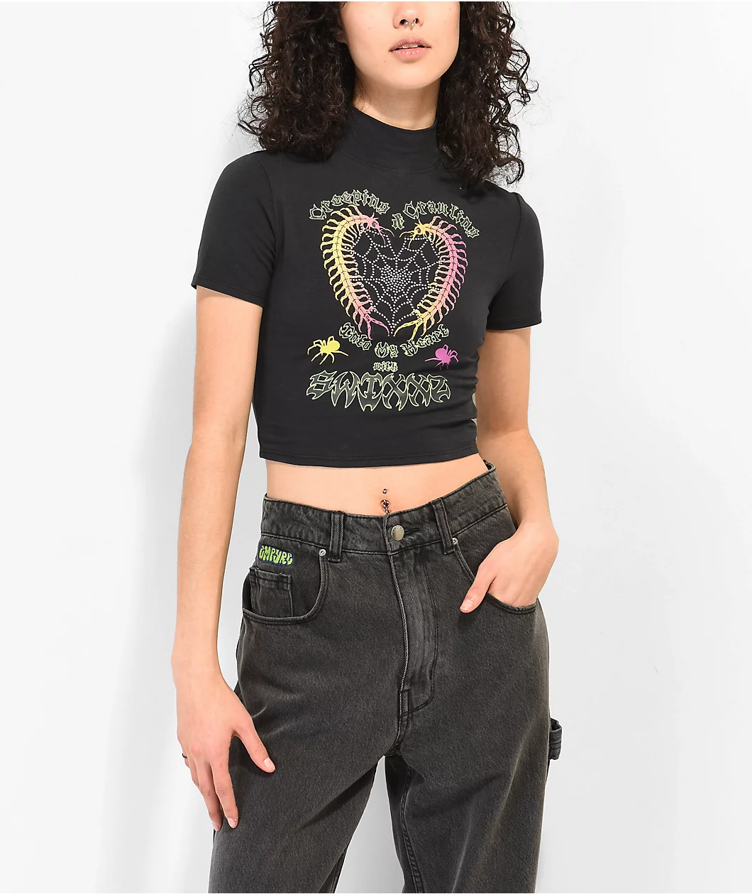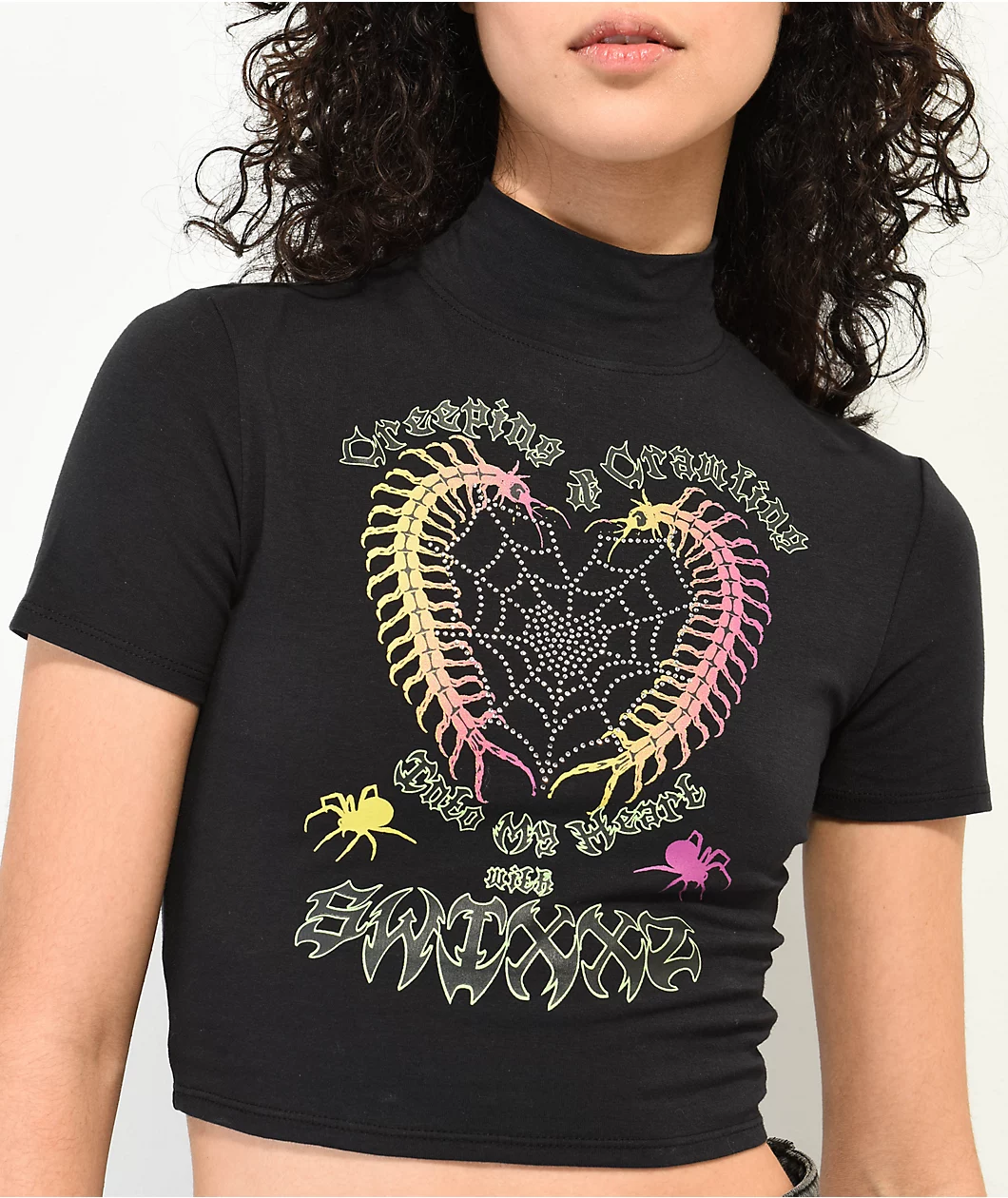 From SWIXXZ, the Centiheart baby tee comes in a black colorway with a unique open back design and buckle closures. The slim turtleneck silhouette boasts screen-printed centipedes on the front, with silver gem stones and text reading: “creeping & crawling | Into my heart with SWIXXZ.”