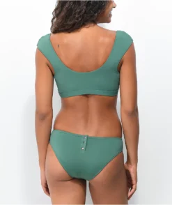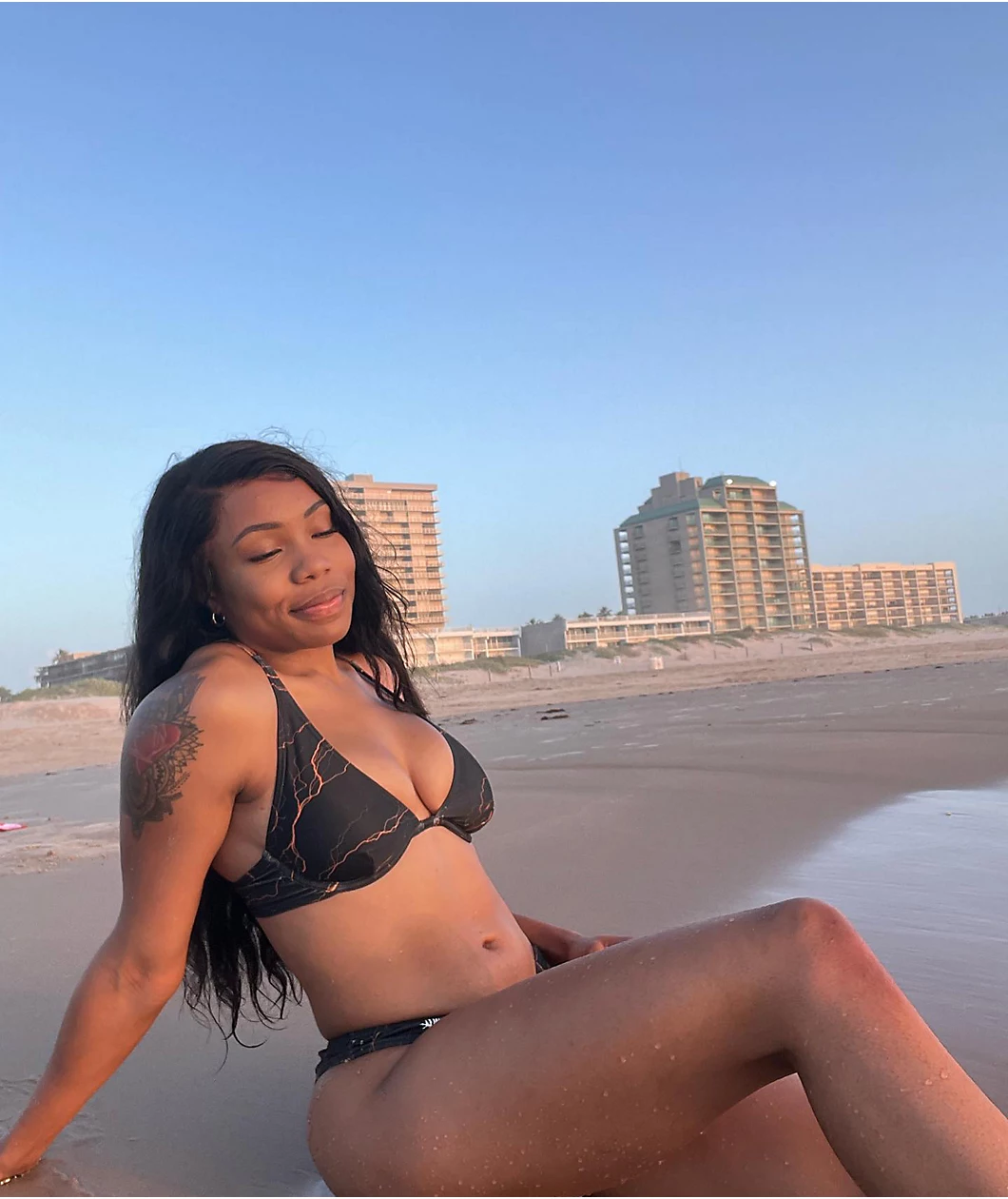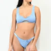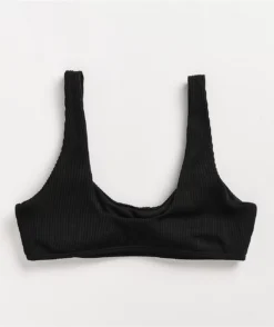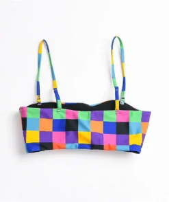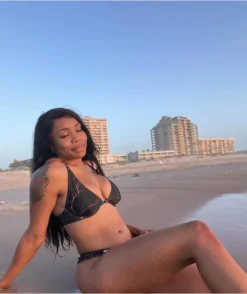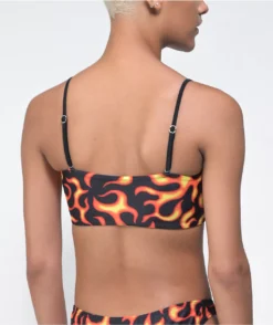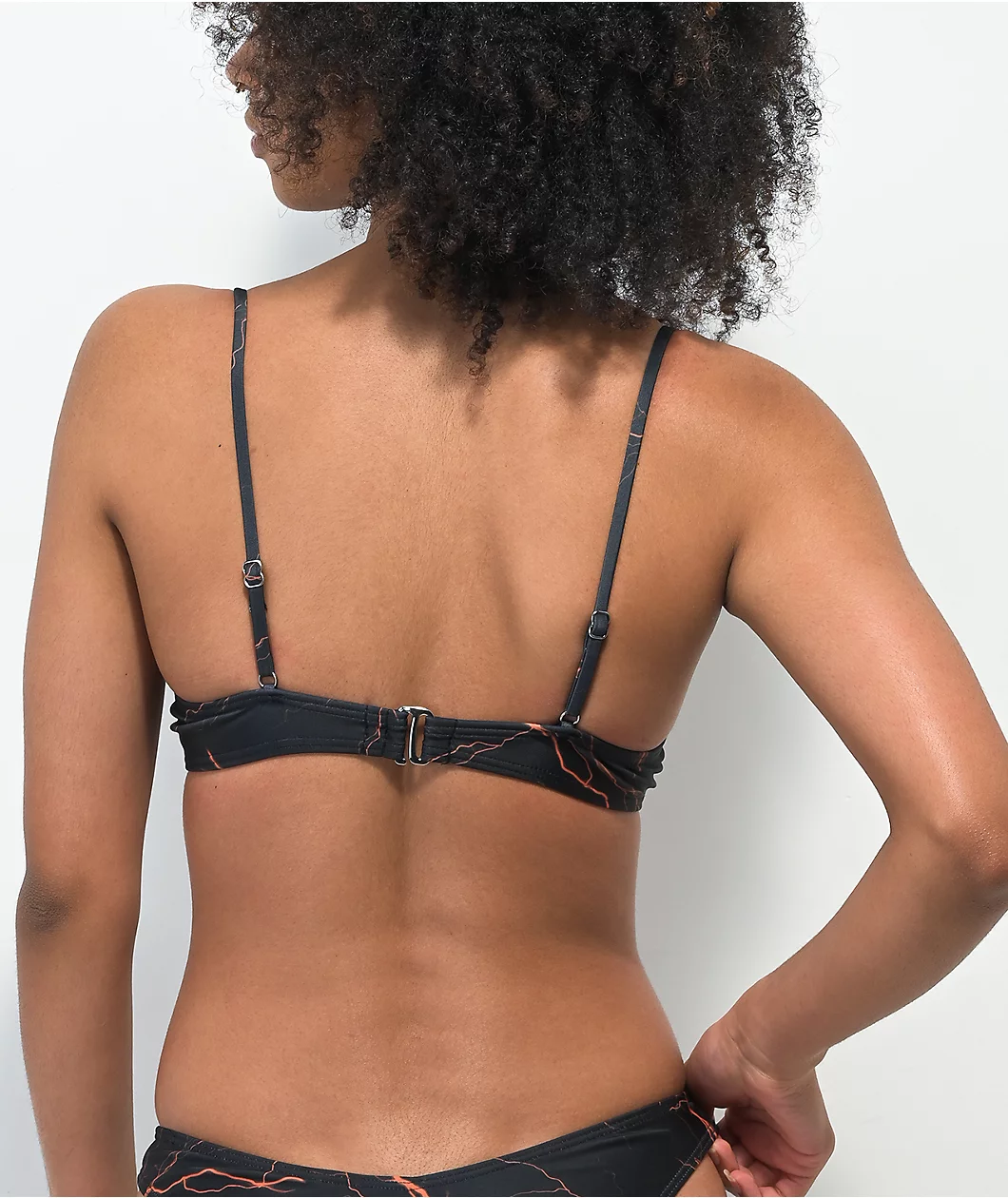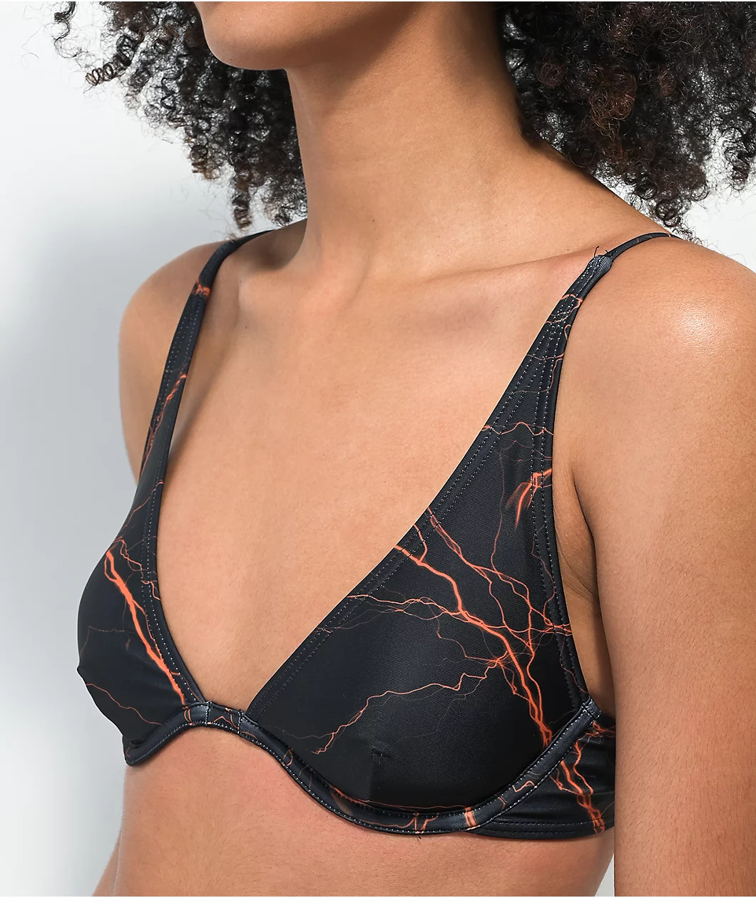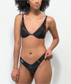 The Orange Lightning bikini bottom from SWIXXZ features a triangle cup silhouette design with adjustable spaghetti straps, comes in black, and is decorated with sublimated graphics of vibrant orange lightning throughout.