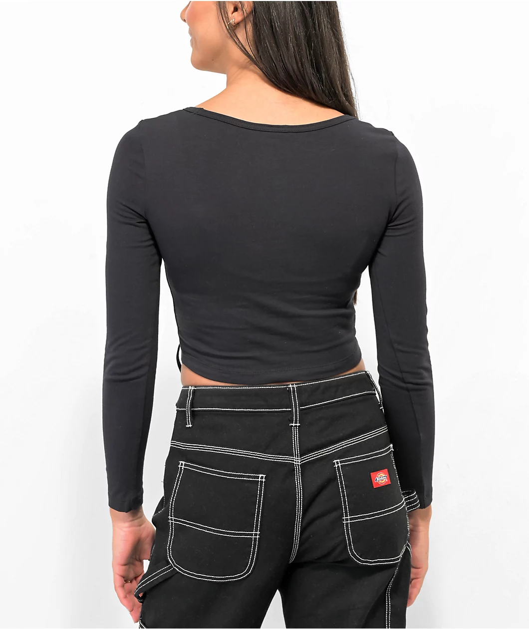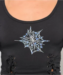 From SWIXXZ, Spider Lace Up long sleeve t-shirt comes in a black colorway, with a cropped silhouette. Screen-printed imagery of a skull and a spider web can be seen on the chest, while lace accents with metallic grommets sit along the bottom hem. With a scoop neck collar and a slim fit, the Spider Lace Up long sleeve is a versatile styling piece.