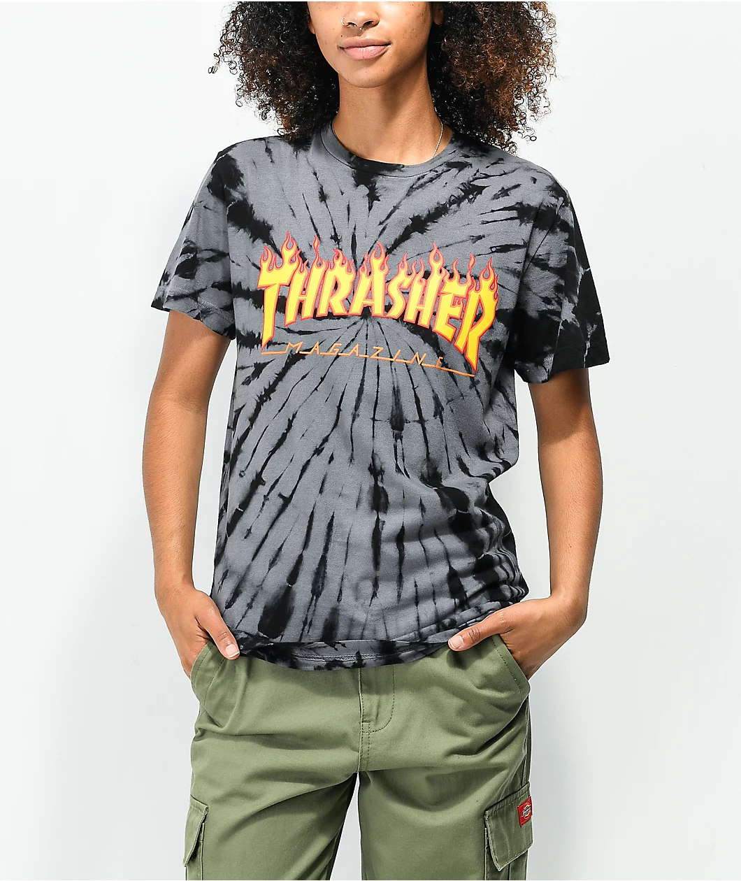 Toss a toasty touch into your tee rotation with Thrasher’s Flame Logo black and grey tie dye t-shirt! Thrasher’s iconic logo sits screen-printed across the shirt’s front, covered in tongues of flame, lending the look some bold, branded detailing, while the spiral black-and-grey tie dye treatment decorating the shirt lends it a splash of contrasting style.