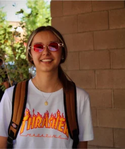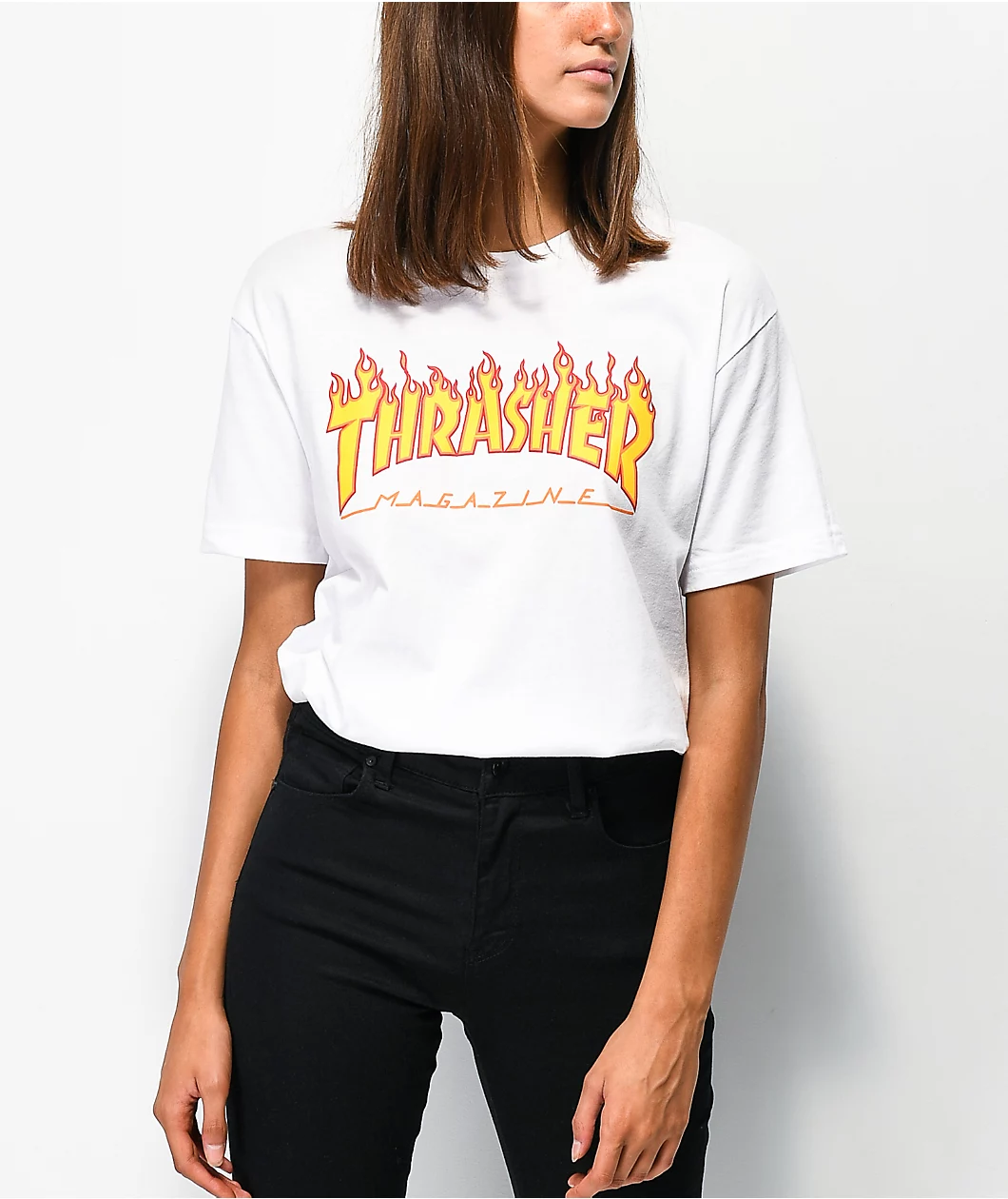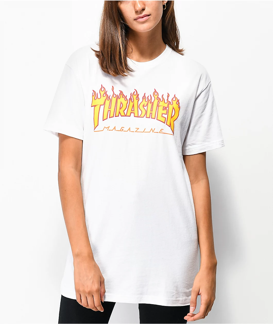 Keep your skate look up to par with this original Flame Logo white t-shirt from Thrasher. The simple yet iconic red and yellow flaming logo makes a statement on the all white crew t-shirt.
