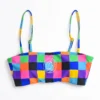 Vibrant, modifiable, and stylish, the Cher triangle bikini Top from Trillium is a can’t-miss. This bikini has a bright yellow colorway with a black and white plaid pattern throughout, with a small knot detail between the cups. The spaghetti-style straps are adjustable and the padding is removable so you can customize your comfort, while the added spandex makes this bikini perfectly stretchy.