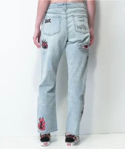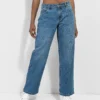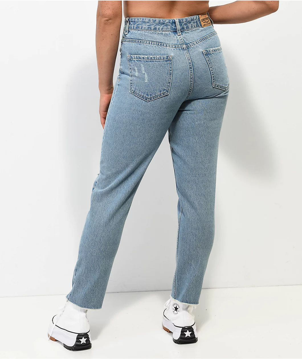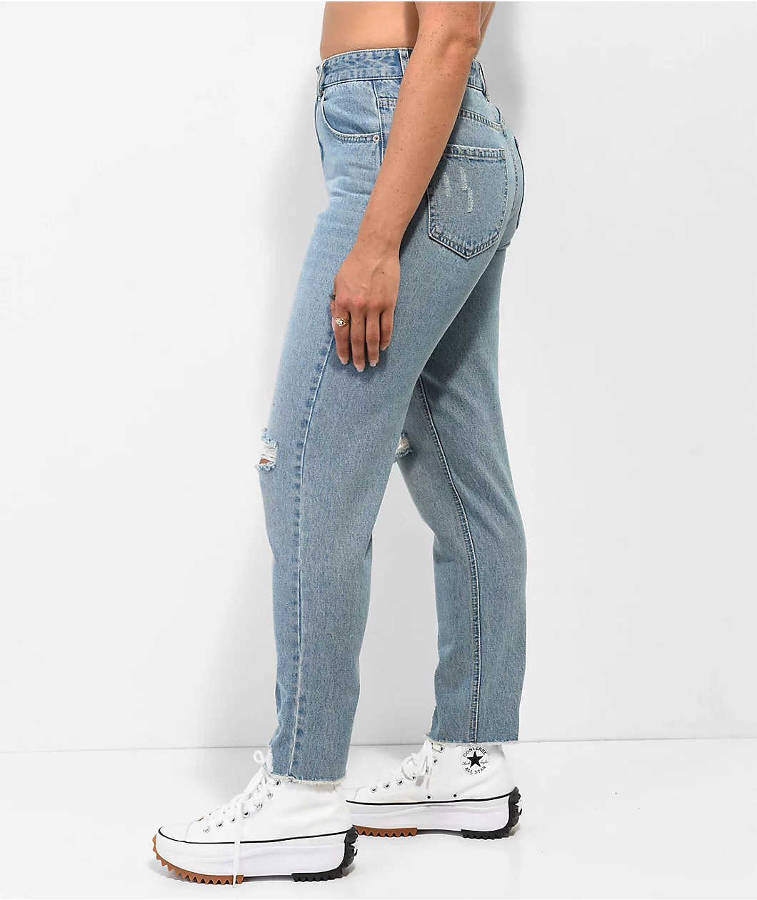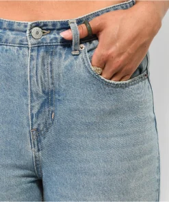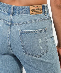 From Unionbay comes the Distressed blue mom jeans in a blue colorway. These jeans come with the standard five pocket configuration, and are complete with a distressed look at the knees and bottom hem for added style.