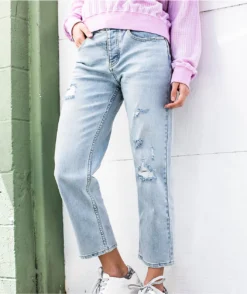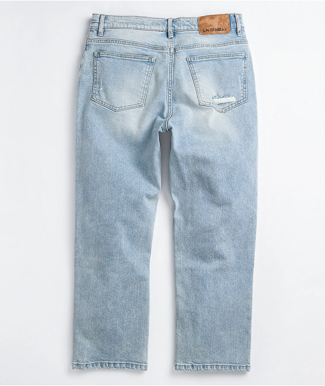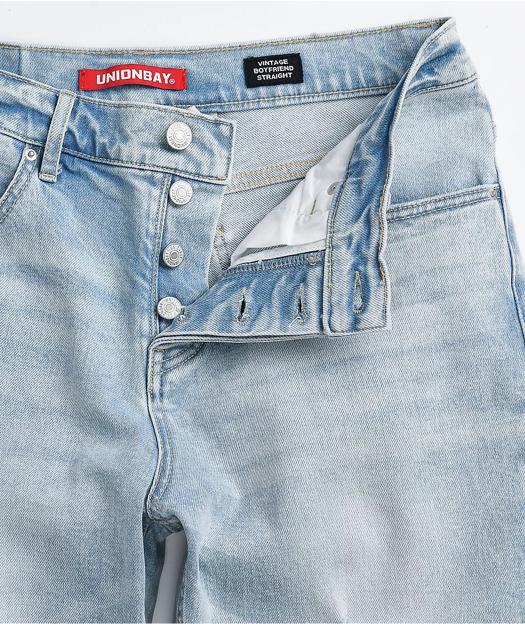 Keep your rotation of jeans on point in comfortable style with a pair of Unionbay Reece Vintage Boyfriend jeans. These classic jeans come in a relaxed fit to maximize comfort points, while the light blue colorway with slight distressing adds a lived in look throughout. A five pocket configuration keeps to an iconic silhouette with functional storage space, and the custom UB hardware adds subtle branded detail to complete this look in style.