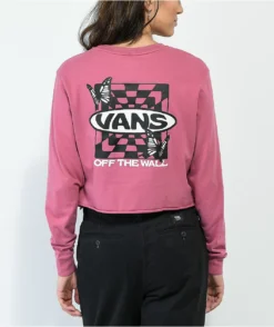 The Deep Root Vans t-shirt comes in a cropped, long sleeve construction with a pink colorway, adorned on the left of chest with the brand logo and flowers, as well as on the back of the brand logo with butterflies and a checkered background. This shirt is made of 100% cotton and features an unfinished bottom hem for added style.