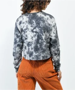 The Moon Caps Vans long sleeve t-shirt has a grey and white tie dye treatment and a screen-printed mushroom and moon graphic on the chest. This Vans shirt has a crop hemline and a slim, flattering fit. Made from super soft, lightweight cotton, this tie dye shirt is easy to layer and pair with a variety of bottoms and outerwear.