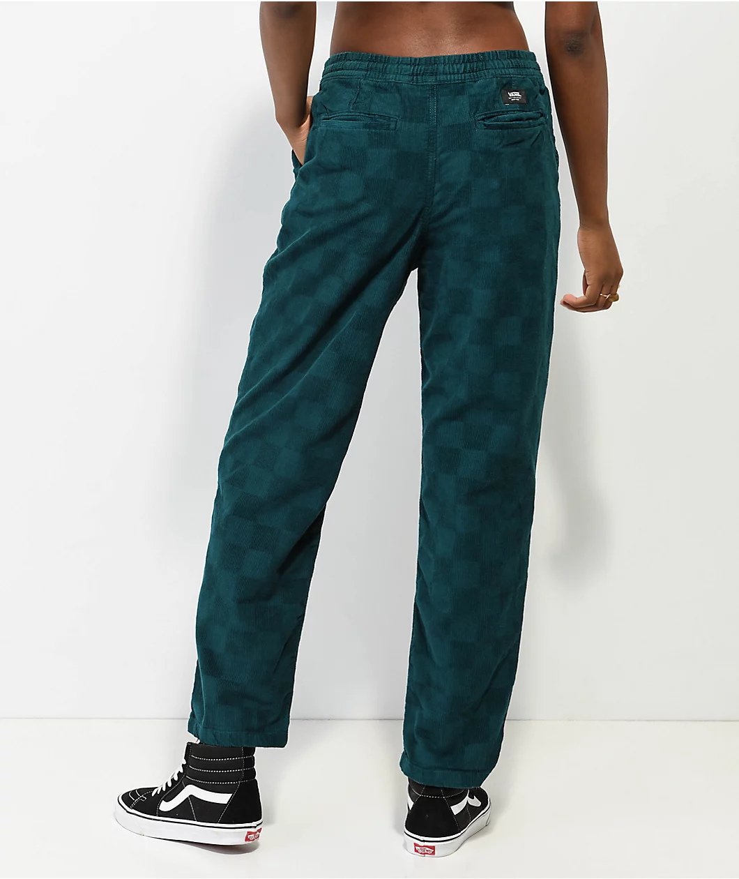 From Vans comes the Range Cord checkered elastic waist pants in a green colorway. Featuring a soft corduroy construction with a subtle embossed checkered pattern throughout, the Relaxed silhouette has a comfortable elastic drawstring waistband for a custom fit. With straight legs, and a standard 4-pocket design for a streamlined look, the fashionable corduroy pants reveal a woven brand label when cuffed.