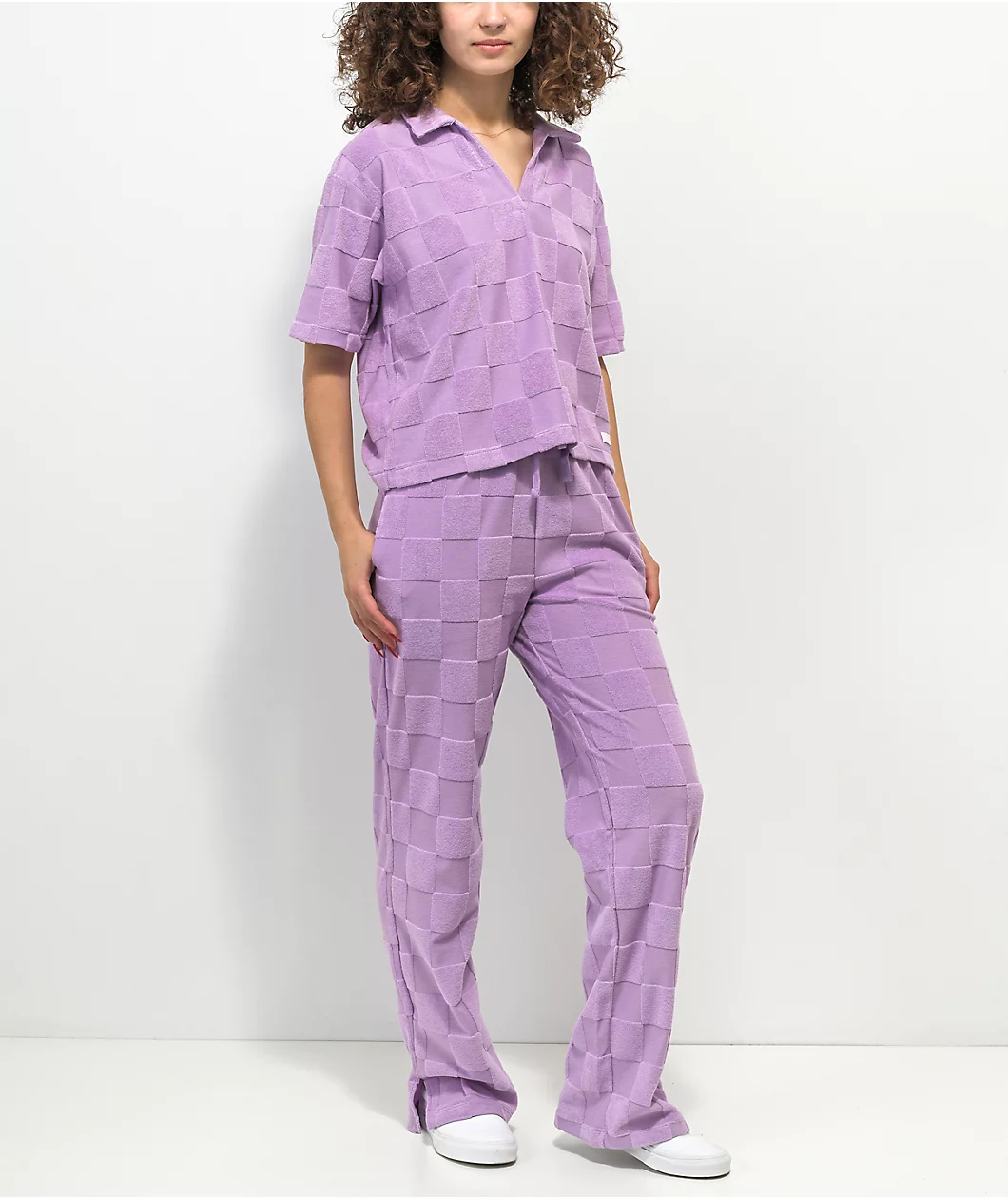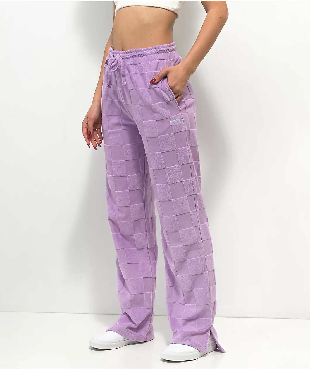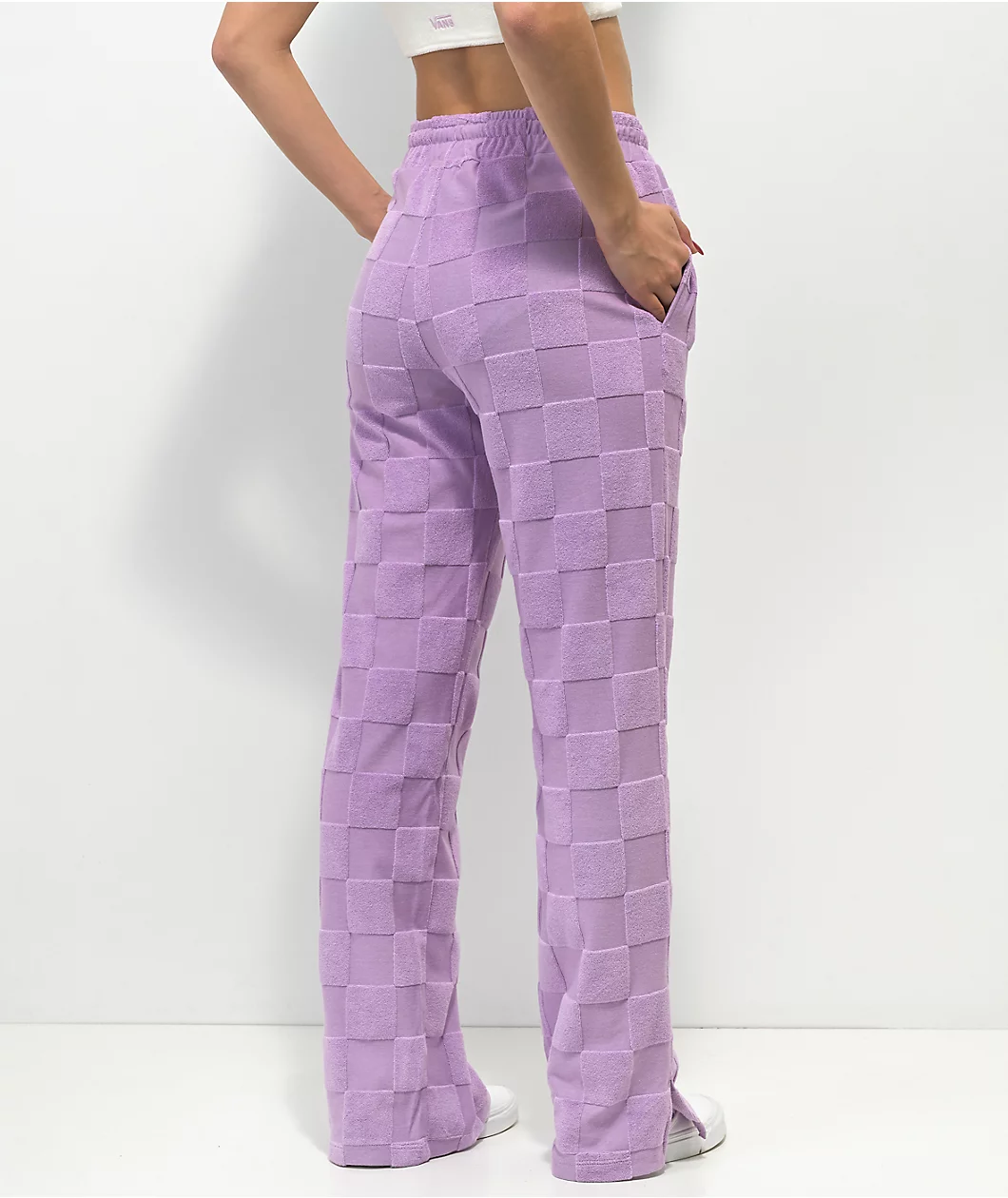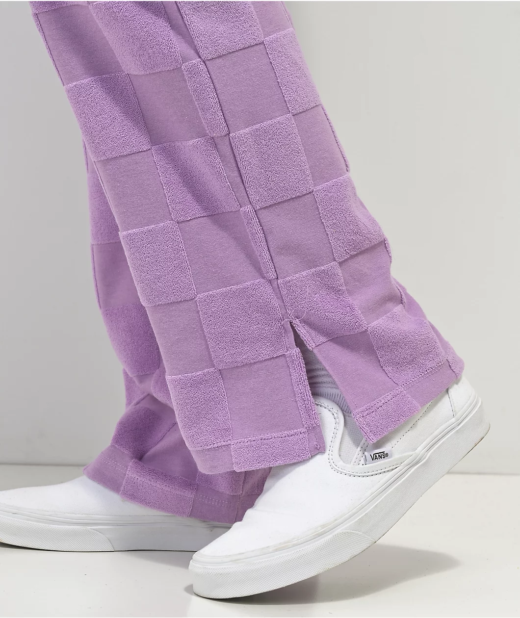 The Teri Vans pants have a relaxed, mid rise fit and a soft Terry cloth construction. These Vans pants have a lavender colorway with checkered detailing throughout. The elastic waistband has a matching purple adjustable waistband for a secure fit, and the leg openings have a split hem for a flared look.
